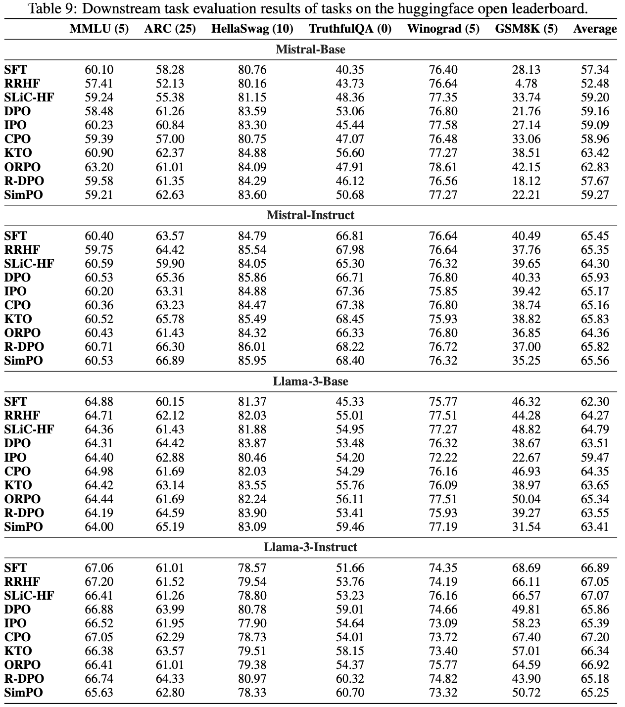 - 不过,DPO、IPO、R-DPO 和 SimPO 在数学推理密集型任务(如 GSM8K)上仍然存在性能下降