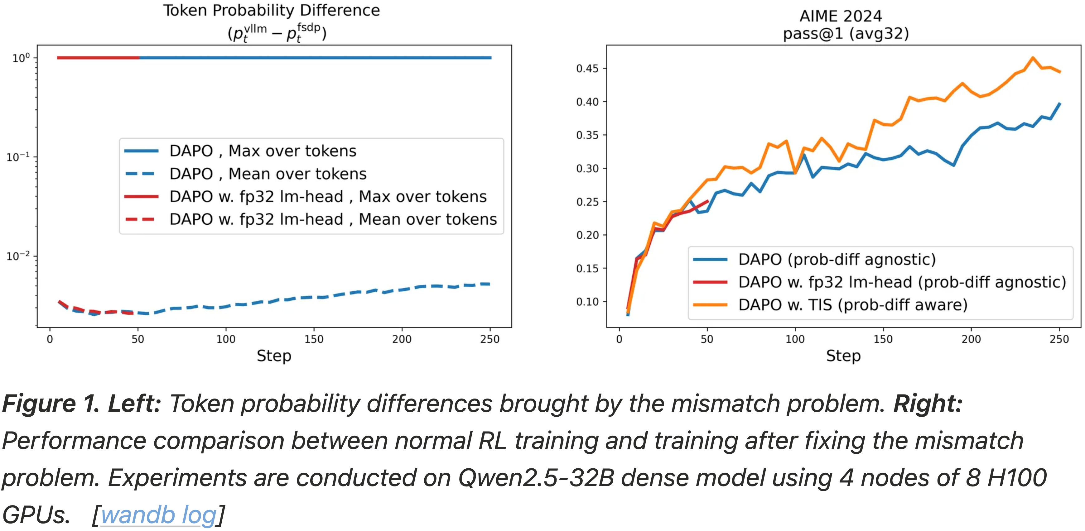 • 左图:由不匹配问题带来的 Token 概率差异(图中横轴是训练步骤,纵轴是差异的 最大值或平均值等)