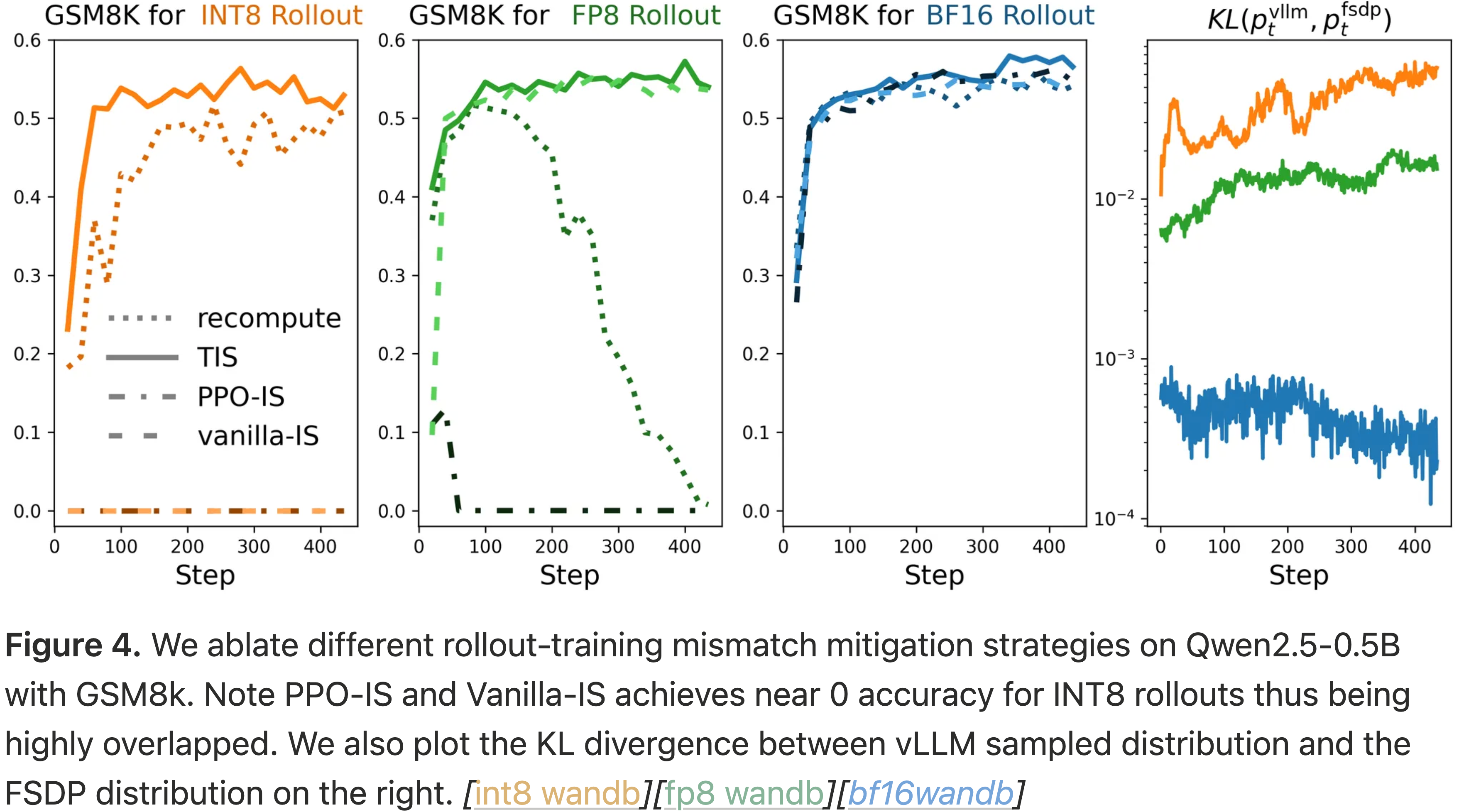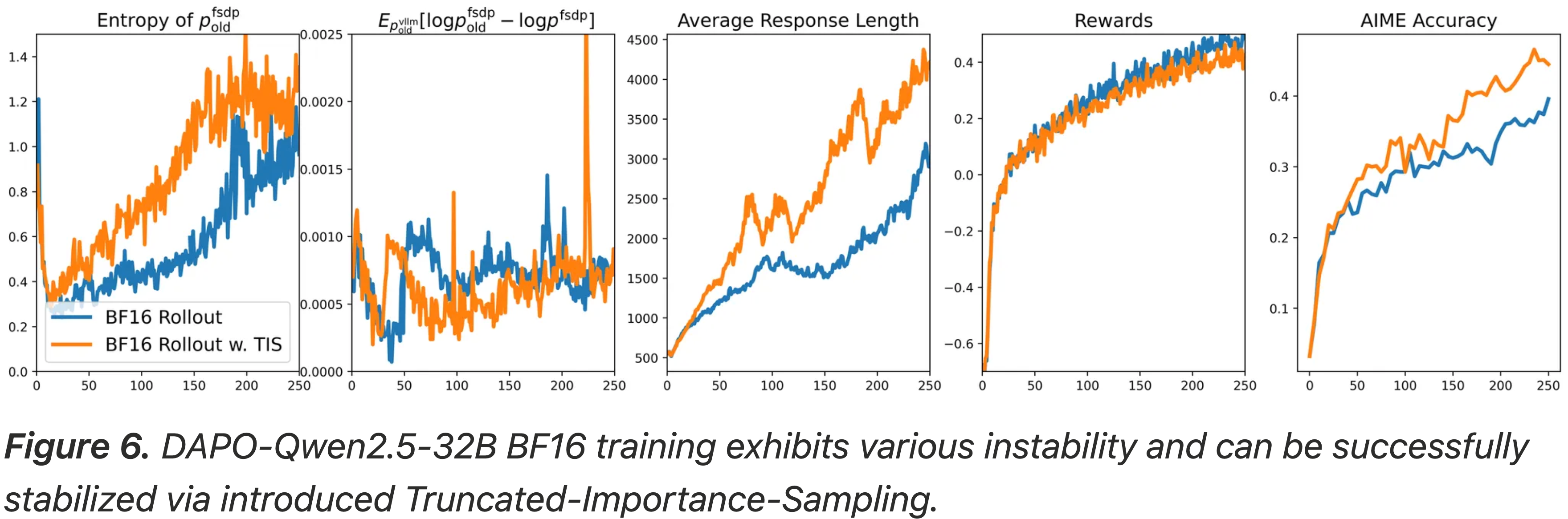 • 与这些工作正交的是,博客的 TIS 修复解决了根源于系统级别的分布不匹配问题,这是由在 rollout 生成和模型训练中使用的不同计算内核带来的。这种问题广泛存在于采用混合计算设计的强化学习训练框架中