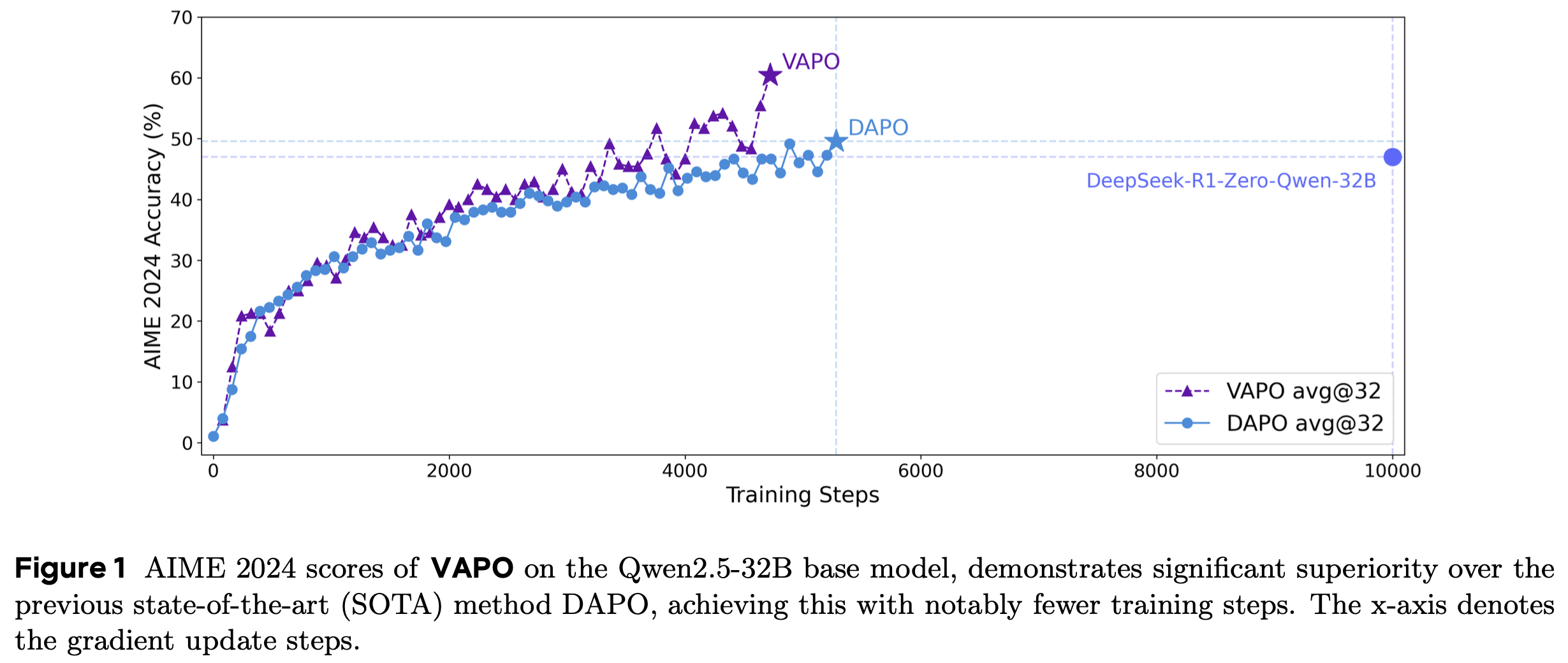 - 论文的 VAPO方法 最终达到 60分,这是一个显著的改进
