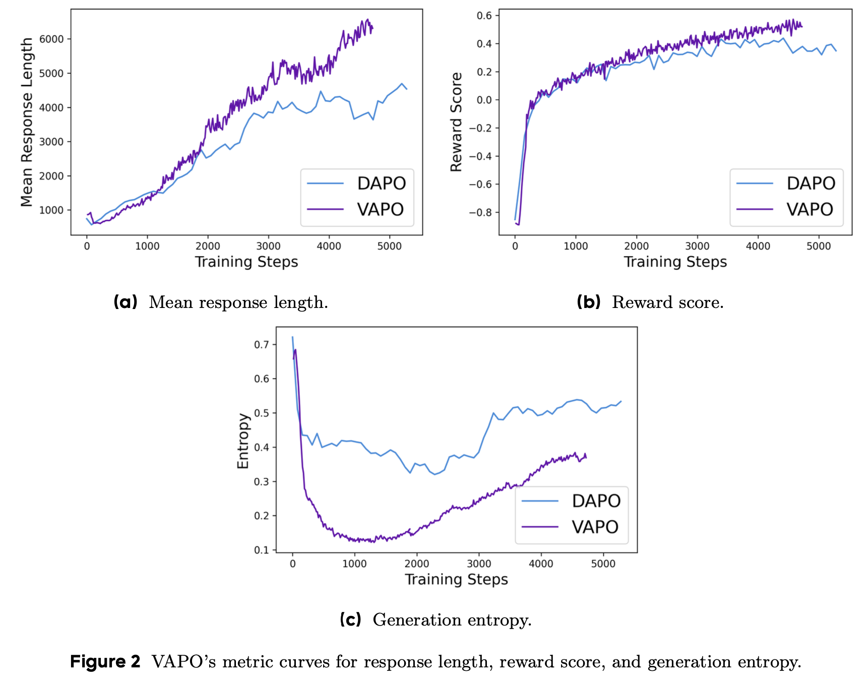 - 如图2a 所示,与 DAPO 相比,VAPO 表现出更好的长度缩放:在现代背景下,更好的长度缩放被广泛认为是模型性能提高的标志,因为它增强了模型的泛化能力