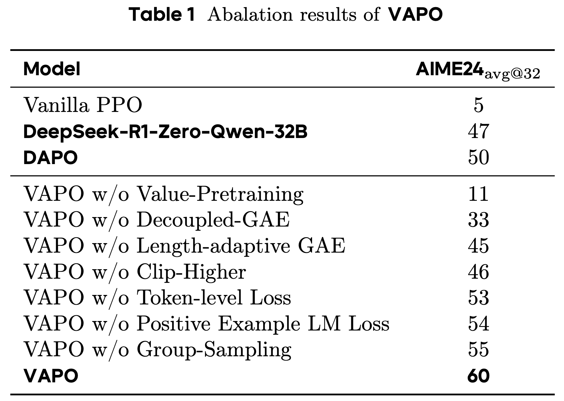 - 论文还将展示从 VAPO 中单独移除这七项修改中的每一项的最终效果
