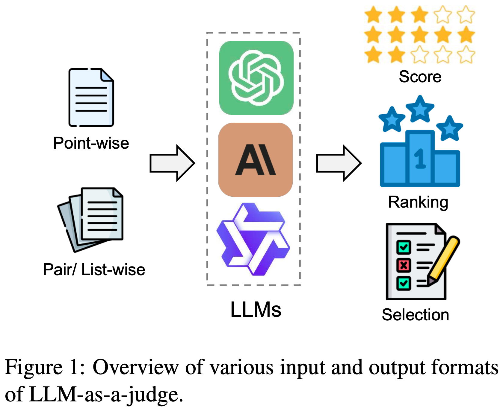 • 成对/ Listwise (Pair/List-Wise) :当 \(n \geq 2\) 时,成为成对(\(n = 2\))或 Listwise (\(n > 2\))评判,此时提供多个候选样本供 Judge LLM 比较并进行综合评估(2023;2024)