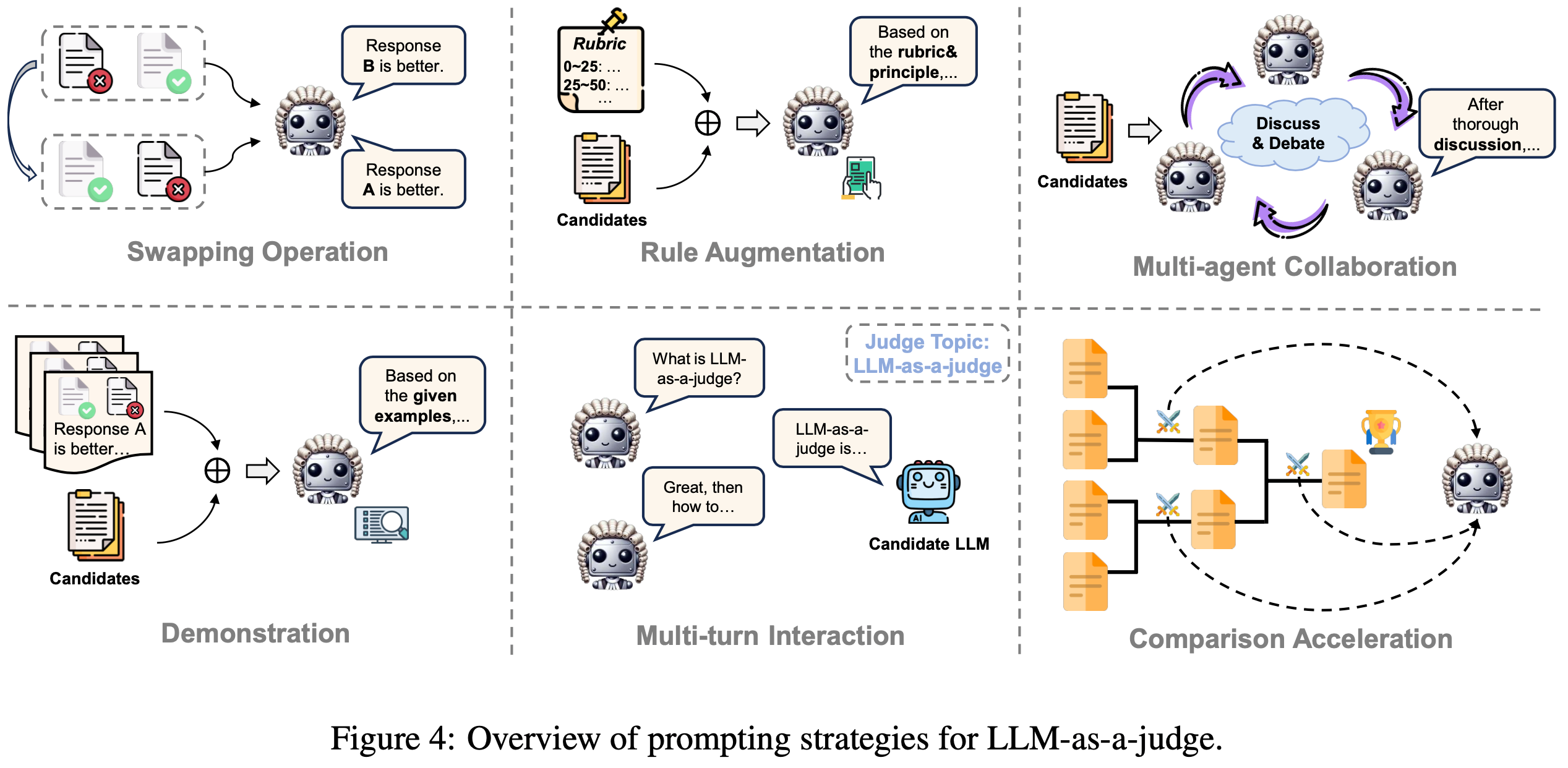 • Methodology如何评判? 论文探索了 LLM-as-a-judge 系统的各种调优和提示技术,包括手动标记数据、合成反馈、监督微调、偏好学习、交换操作、规则增强、多智能体协作、演示、多轮交互和比较加速
