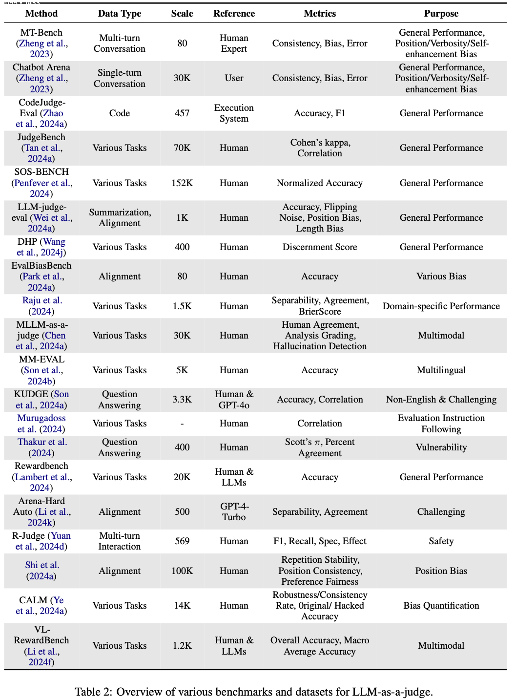 • 表 2 展示了LLM作为评判的各种基准和数据集的集合
