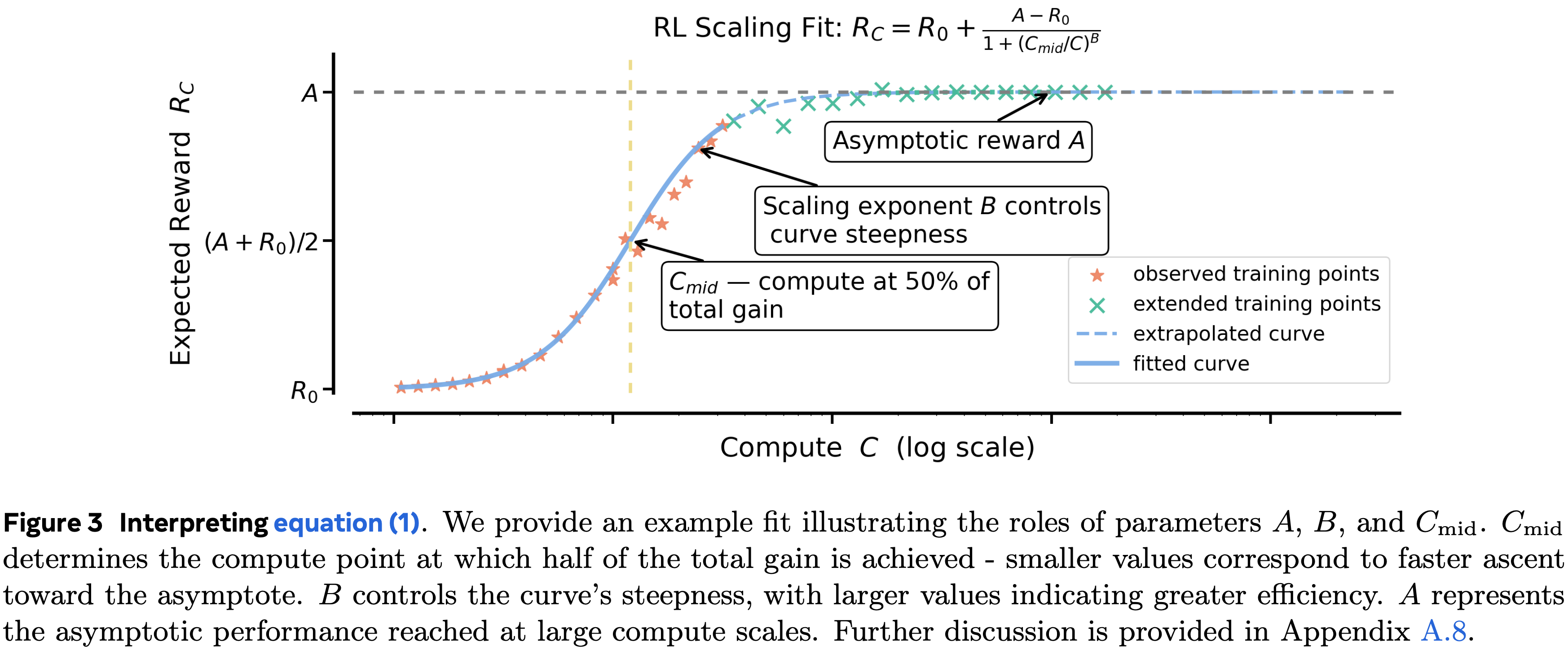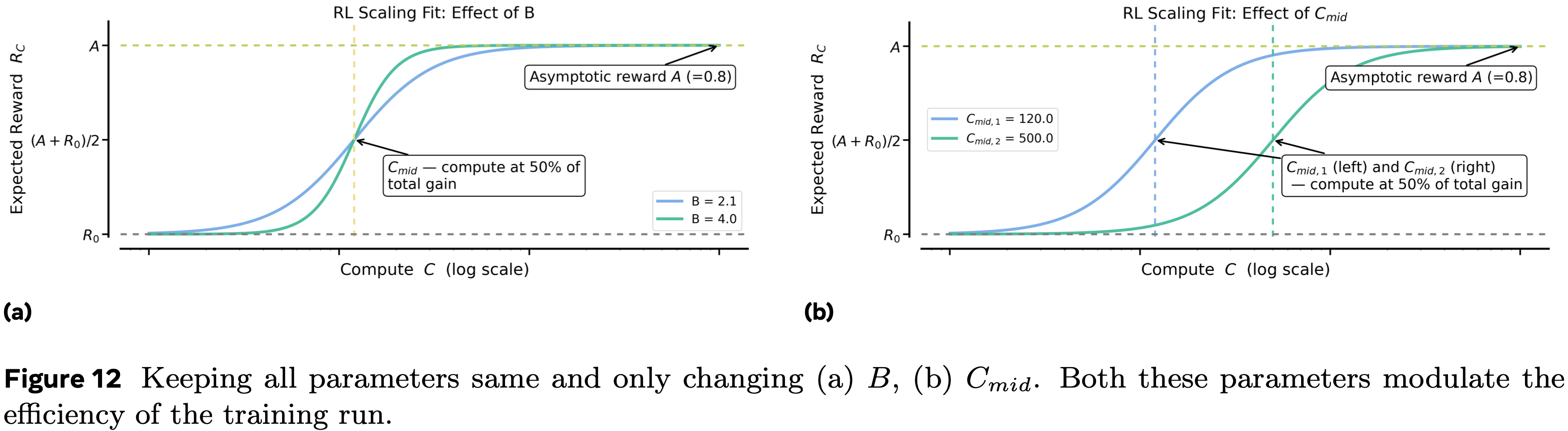 $$\boxed{ \overbrace{R_{C}-R_{0} }^{ \text{Reward Gain} } = \overbrace {(A-R_{0})}^{ \text{Asymptotic Reward Gain} } \times \frac{1}{\underbrace{1+(C_{\rm mid}/C)^{B} }_{ \text{Compute Efficiency} } } } \quad \quad \text{(fixed model and traning data)} \tag{1}$$ - \(0\leq A\leq 1\) 代表渐近通过率