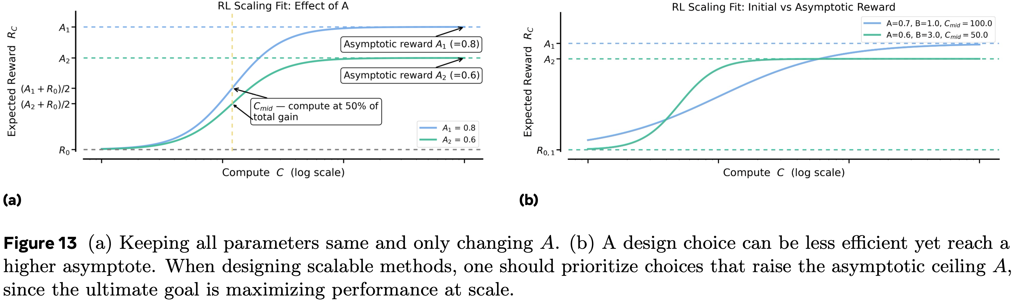 - RL 性能上限并非普适(RL Performance Ceilings are Not Universal) :当我们为不同方法扩展训练计算量时,它们会遇到不同的可达到性能上限 (\(A\))