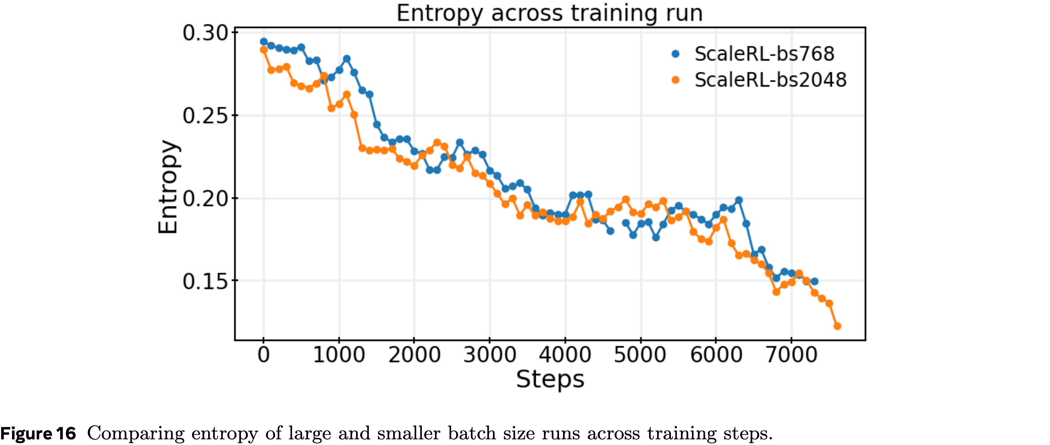 - 在第本节中,论文绘制了批次大小为 768 和 2048 的 ScaleRL 运行的熵
