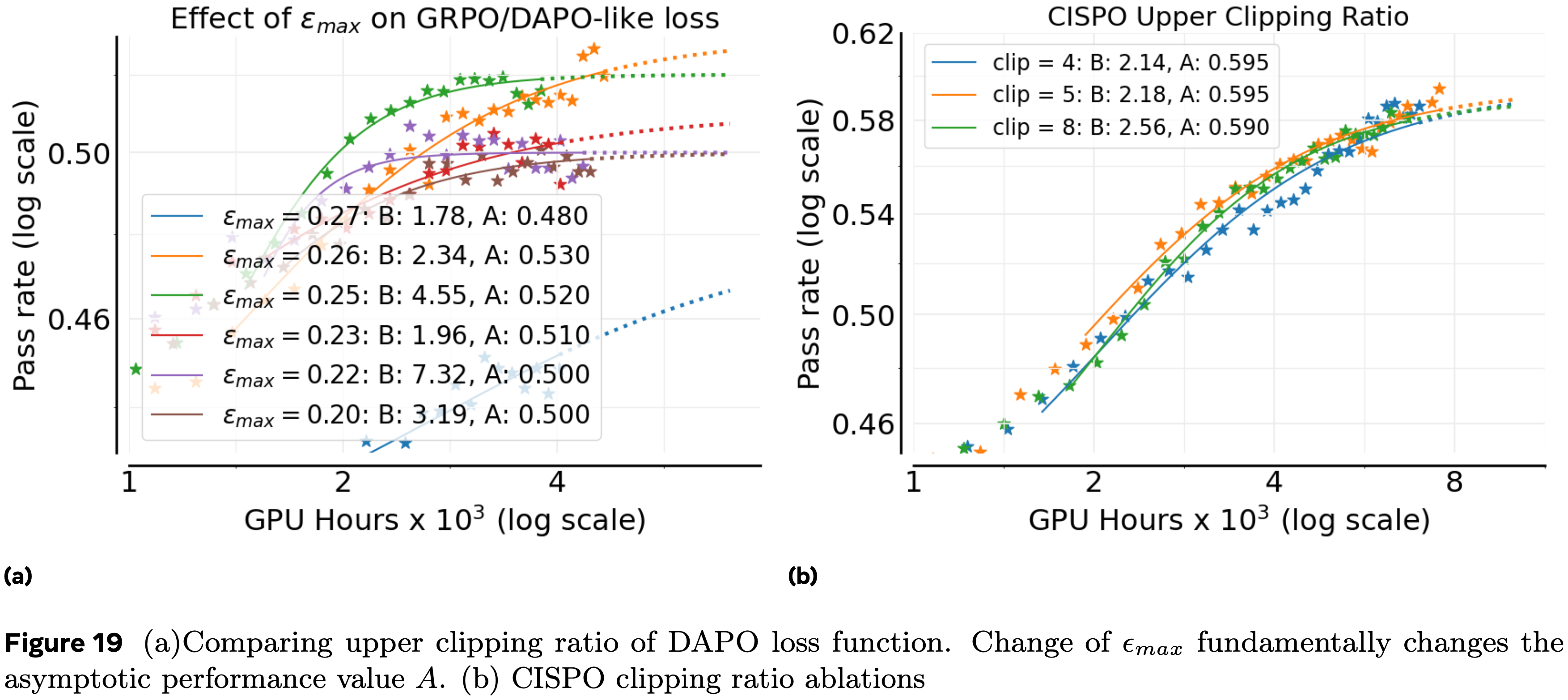 - 论文消融了 CISPO 的较高裁剪比率,将较低裁剪比率固定为 \(0\)(图 19b)