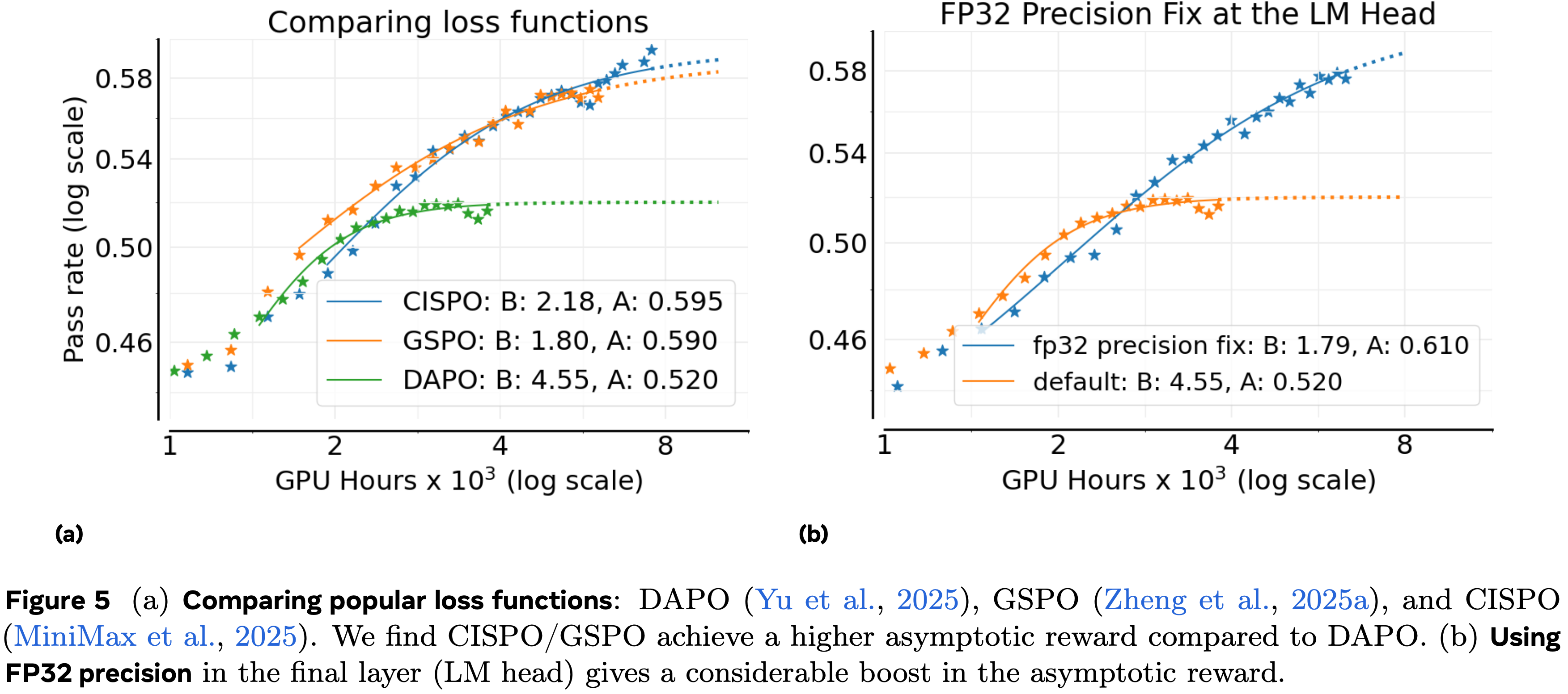- 总的来说,虽然所有三种损失系列在调整好的设置下都可以具有竞争力,但 CISPO 在稳定性和对超参数的稳健性方面提供了最佳平衡 ,使其成为论文推荐的选择