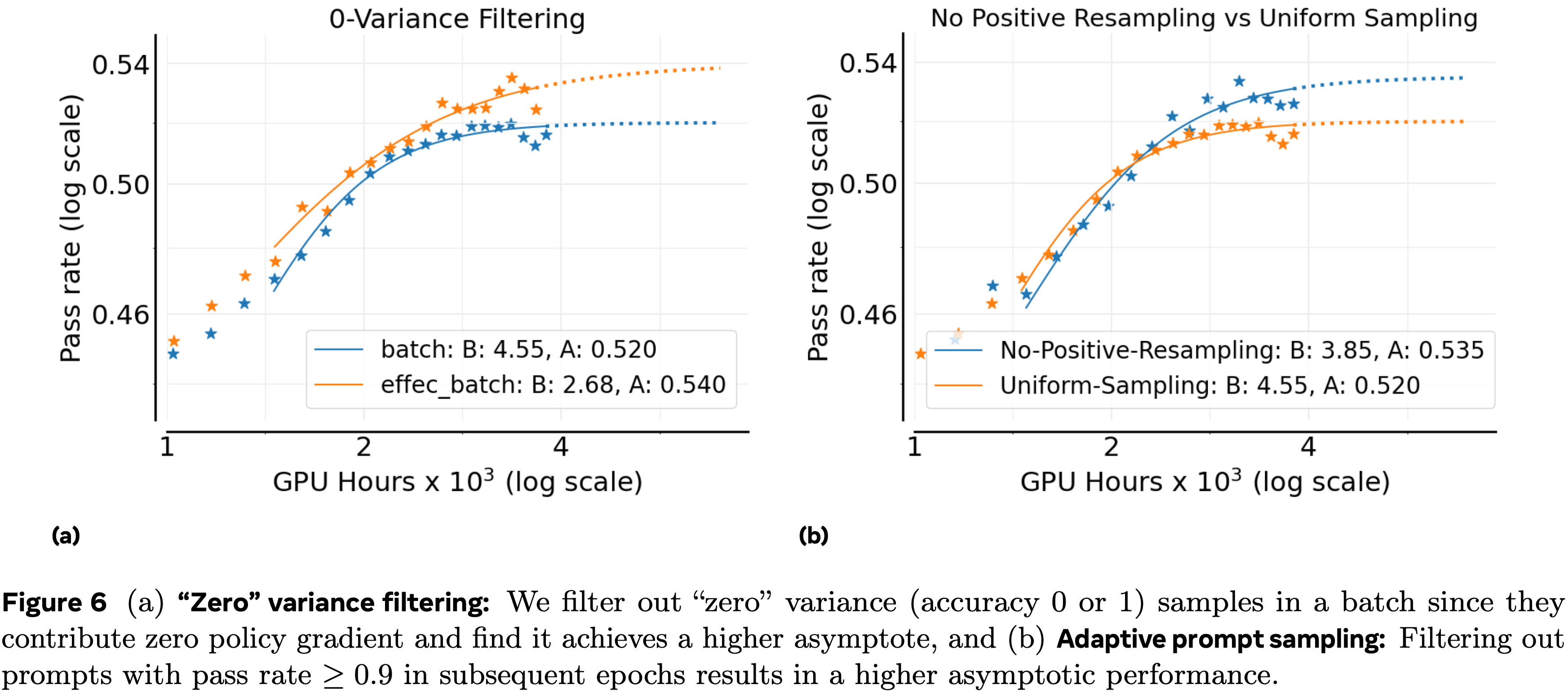 - 为了解决这个问题,论文保持一个更大的批次大小 1280(80 个提示,每个 16 个生成),并从批次中丢弃方差为零的提示