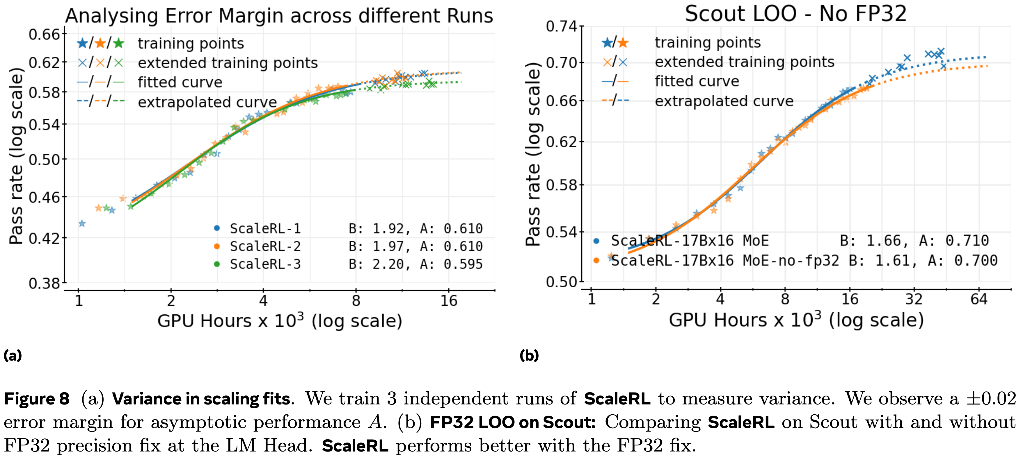 - 在一个大规模的100,000 GPU hous 训练运行中,论文展示了 ScaleRL 的性能与论文的框架预测的扩展曲线紧密匹配(图 1)