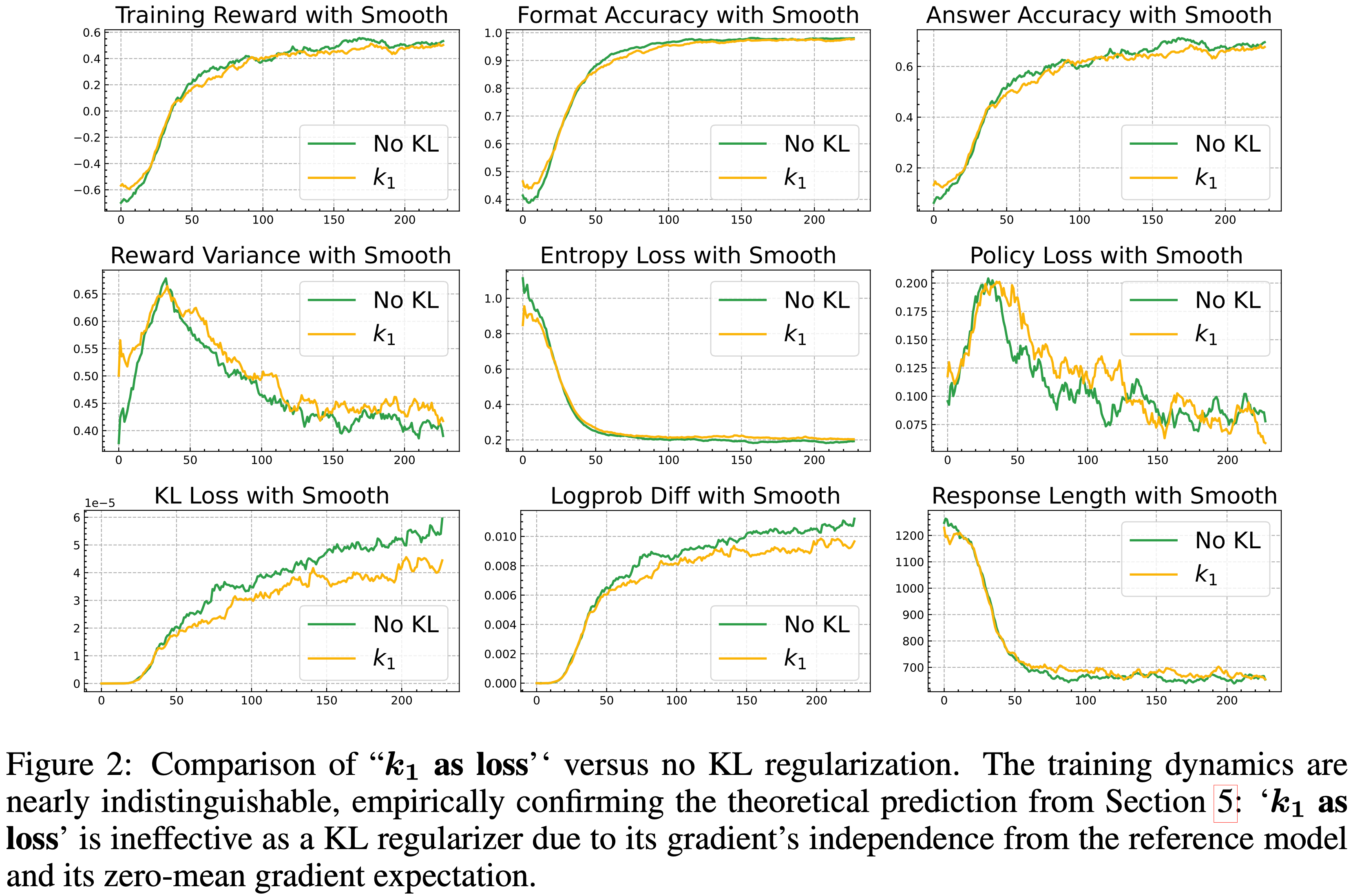 - 训练动态几乎无法区分,这实证地证实了第 5 节的理论预测:由于\(k_1\) as loss的梯度独立于参考模型且其梯度期望为零均值,因此它作为 KL 正则化器是无效的
