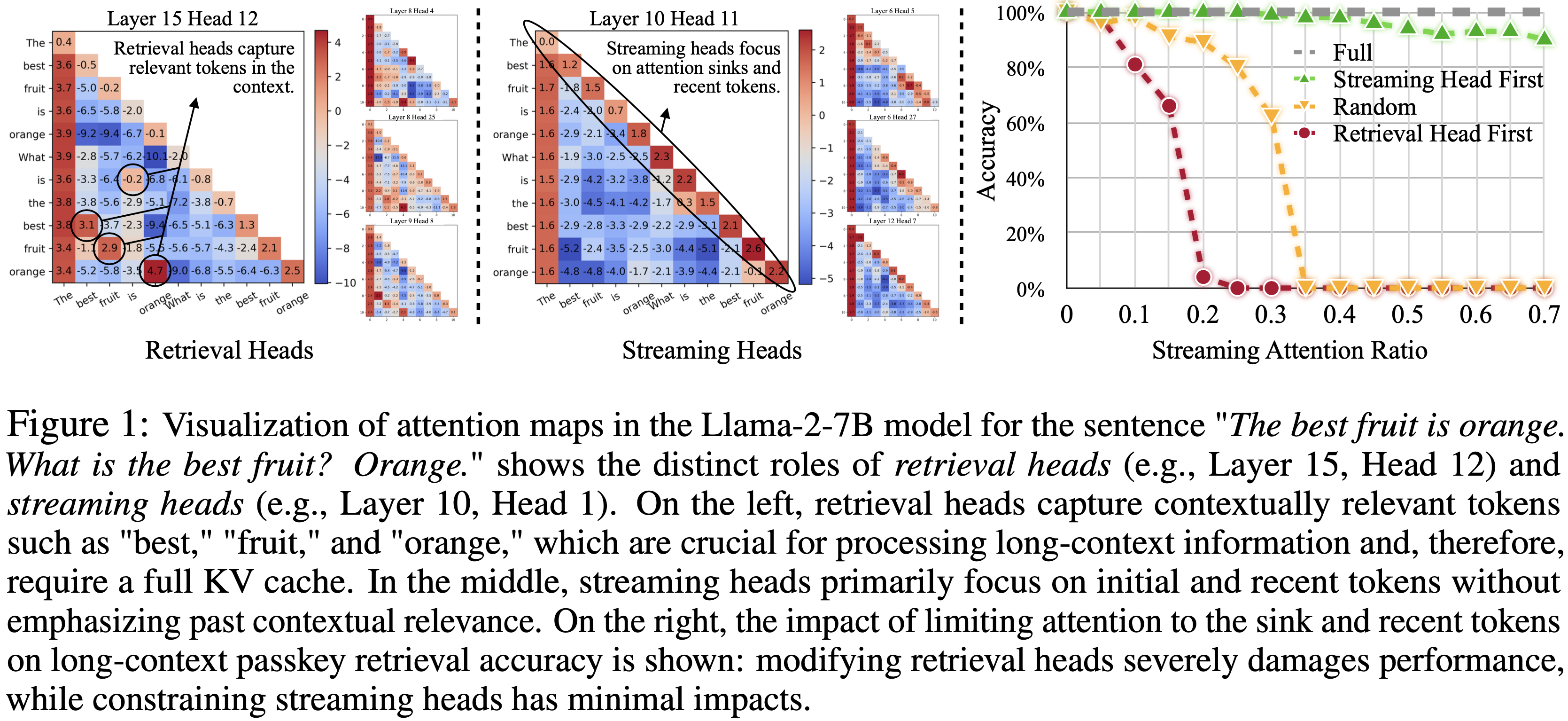 • LLM 中的注意力头可以分为两种不同的类型Retrieval HeadsStreaming Heads ,如图 1 所示