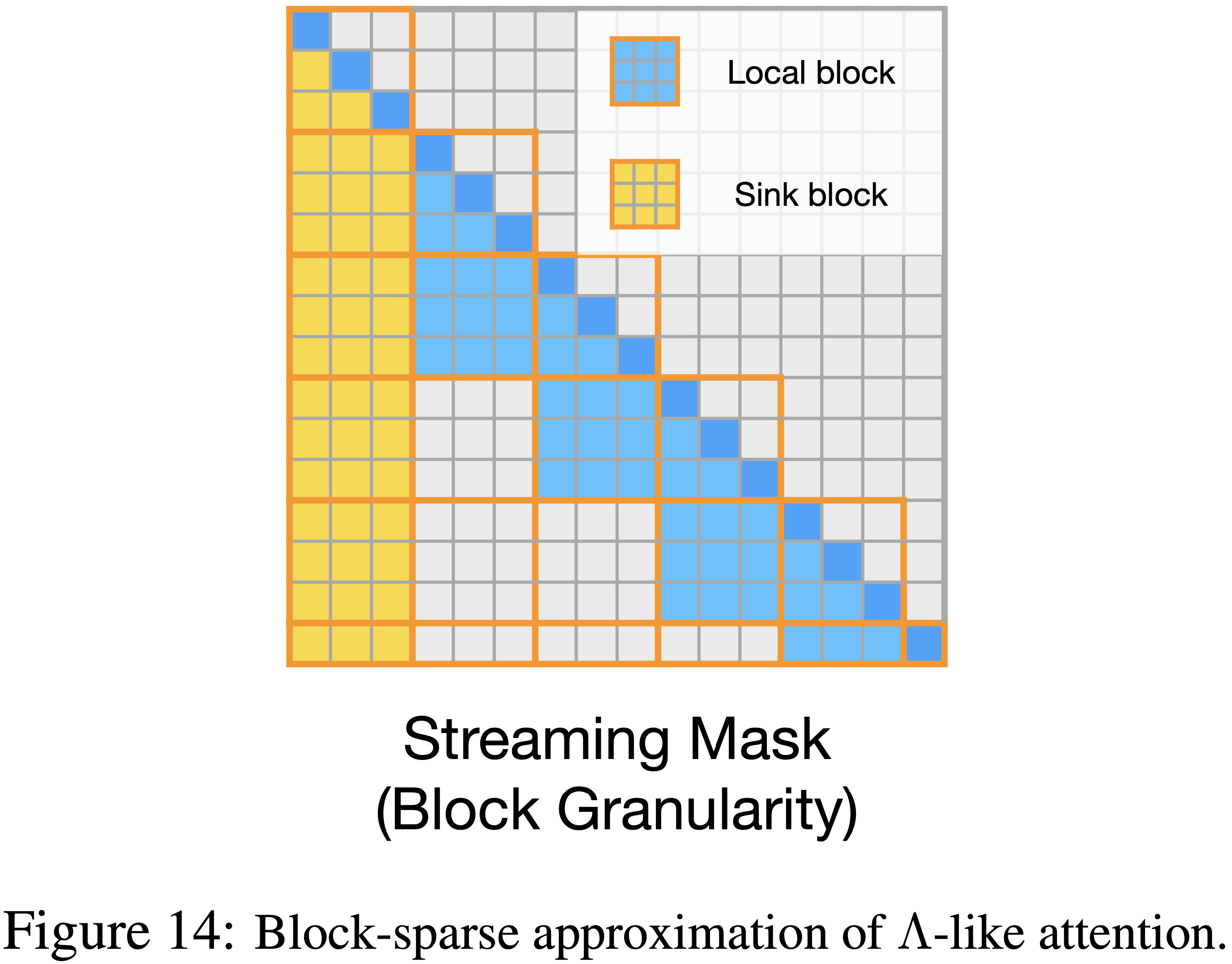 • 在训练期间,论文使用 Guo 等人 (2024) 实现的、如图 14 所示的高效块稀疏近似 \(\Lambda\) 类注意力来计算流式注意力
