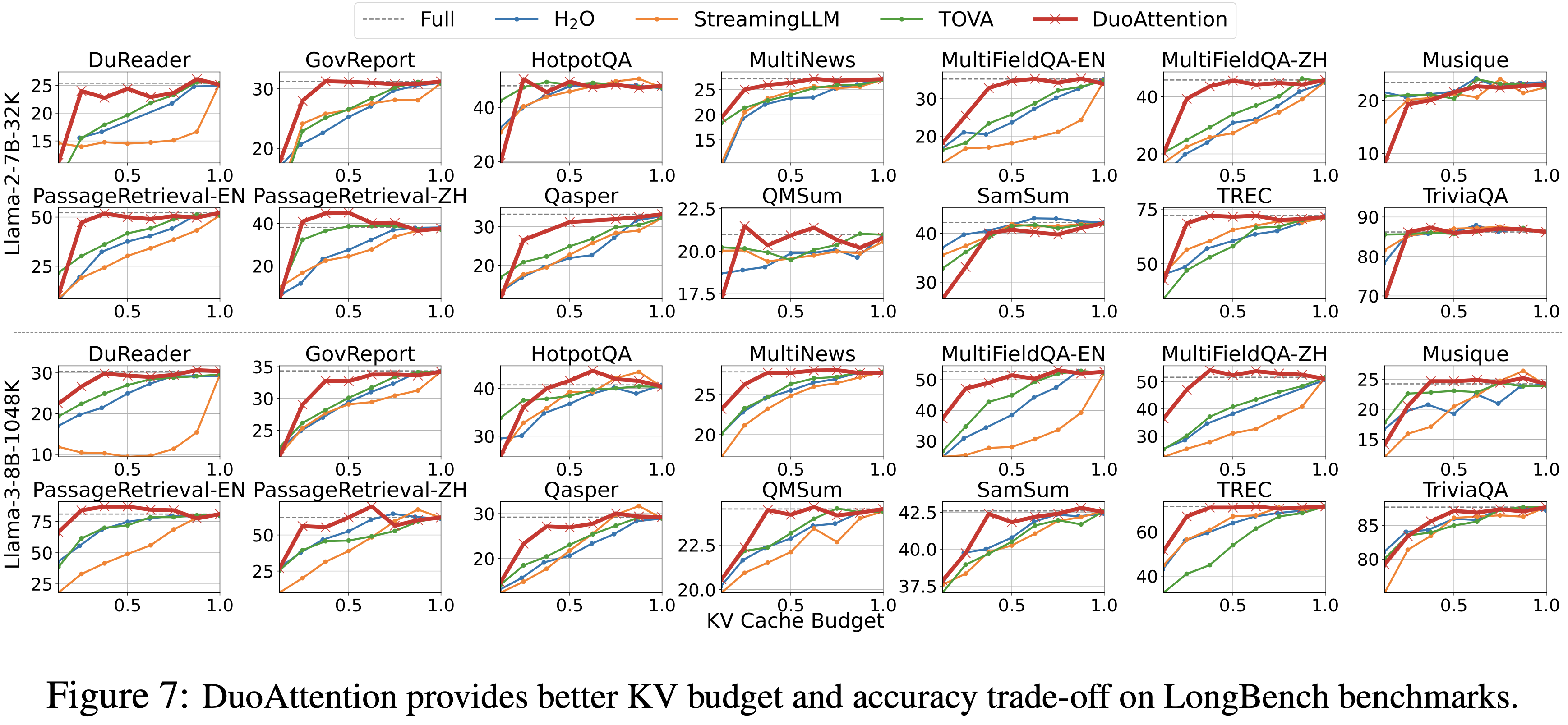 • 这些方法提高了计算性能,但它们没有解决 KV 缓存大小减少的问题,它们与 DuoAttention 互补,以实现额外的速度和内存优化