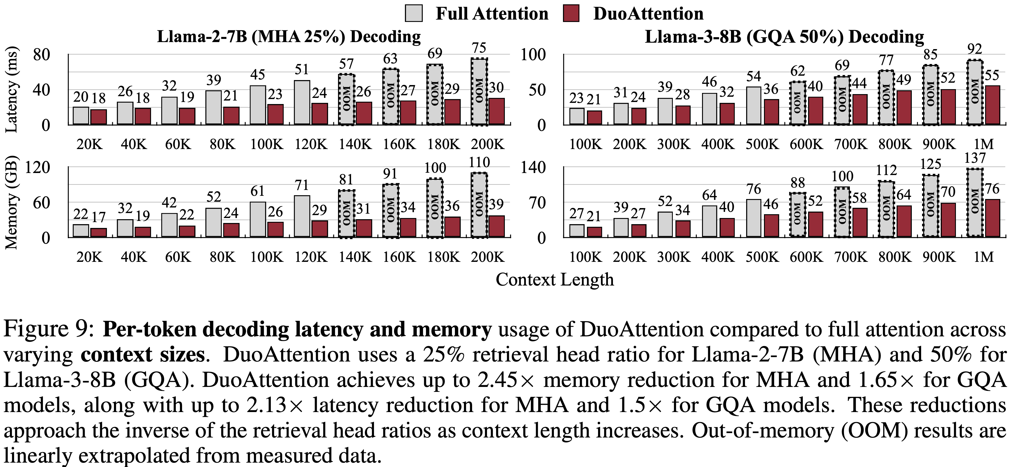 • 具体:DuoAttention 可以显著减少了长上下文应用中解码和 Pre-filling 的内存使用和延迟