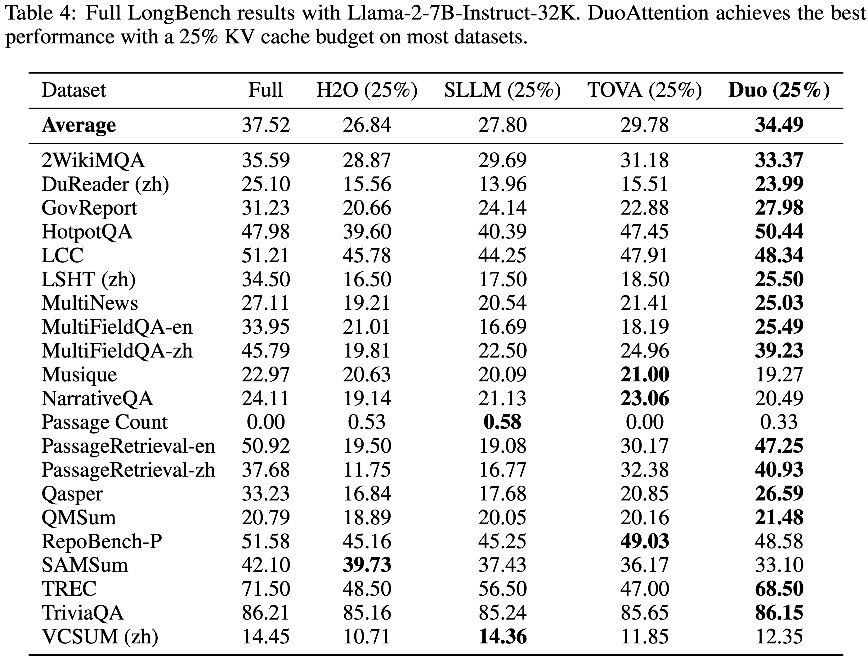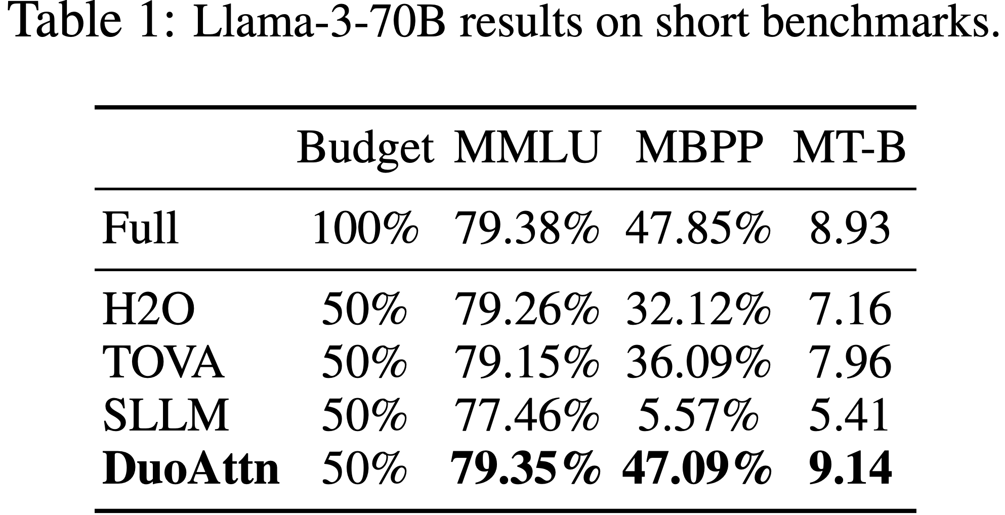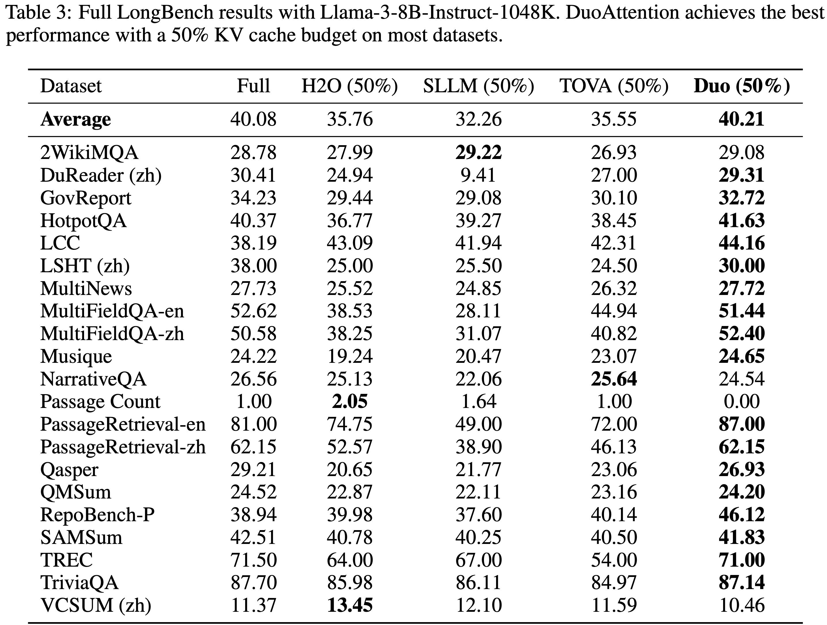 • DuoAttention 的设计注重简洁和高效:每个 Transformer 层有两个 KV 缓存