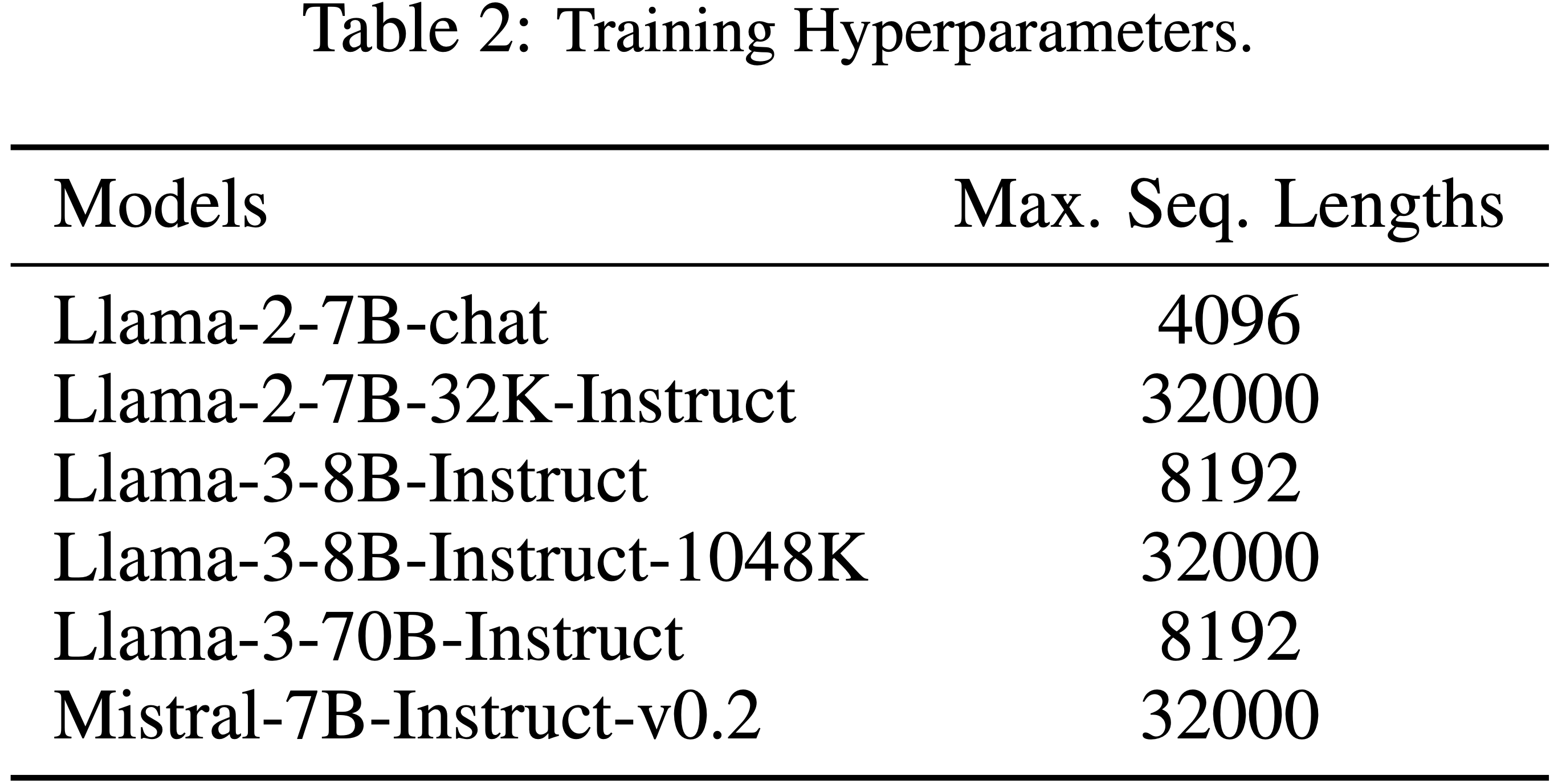 • 对于长上下文基准测试,论文使用了 8 个 A100-80G GPU,对于 Llama-2-7B 模型实现了最高 24k Token 的序列长度,对于 Llama-3-8B 模型实现了最高 32k Token 的序列长度