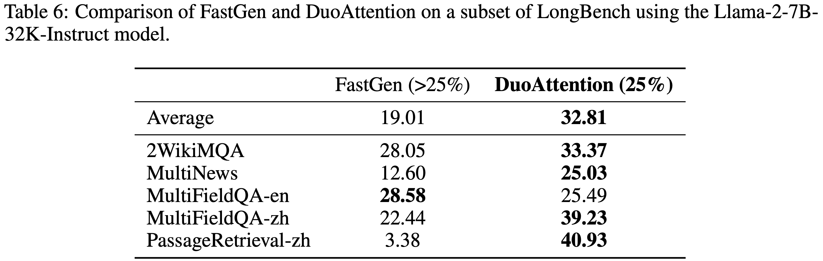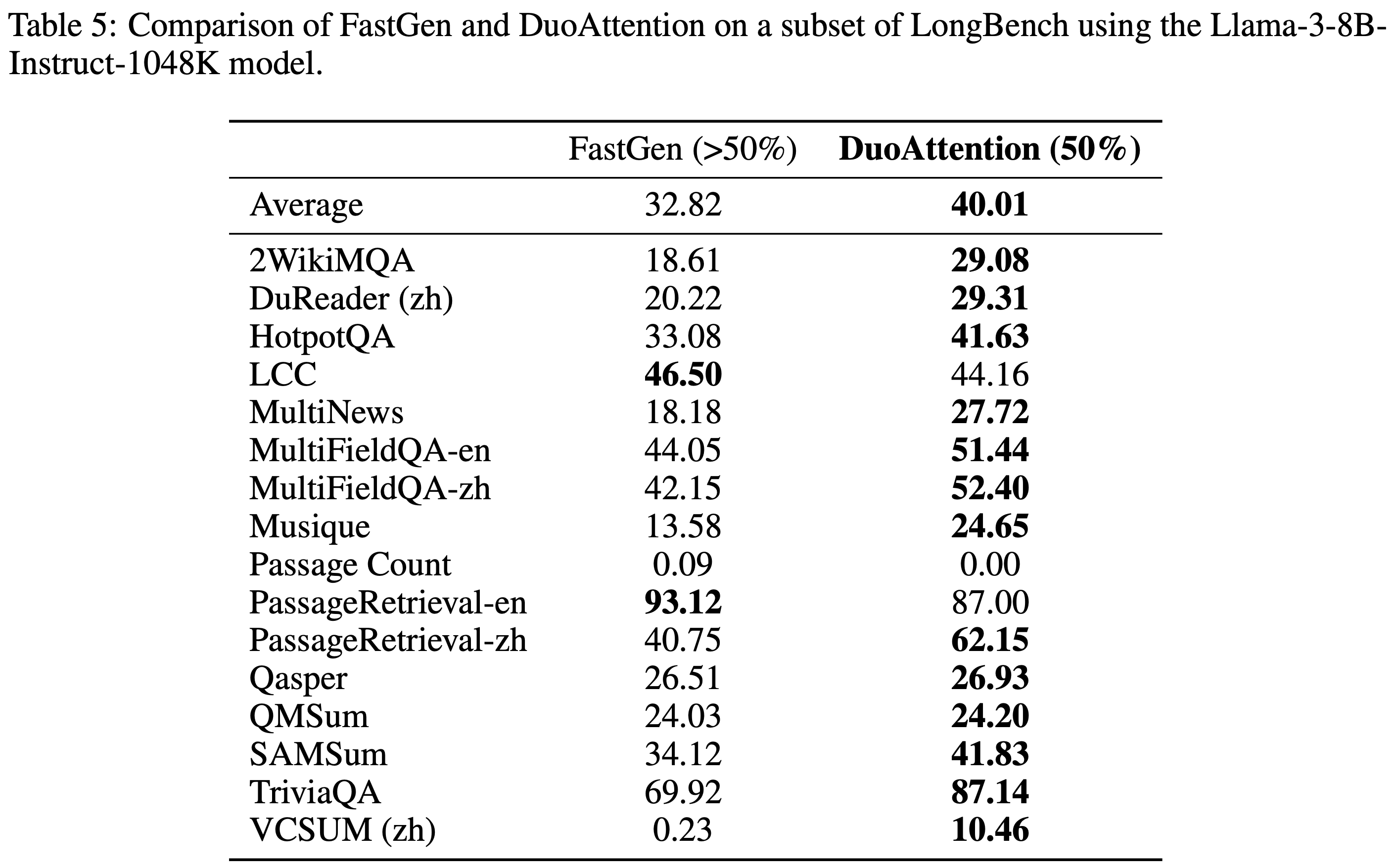 • 如表 5 和表 6 所示,DuoAttention 在 LongBench 数据集上 consistently 优于 FastGen
