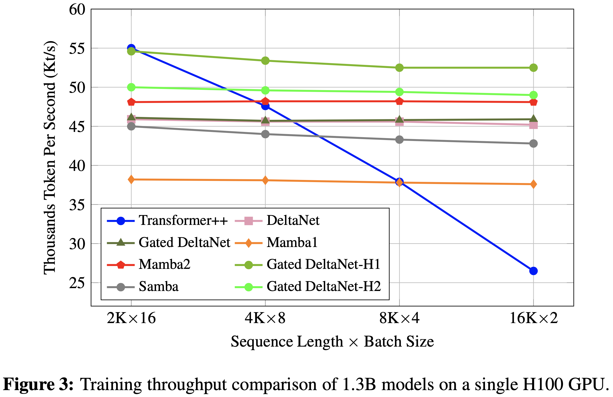 • 正如论文的分析所示,与原始 Delta 规则相比,提出的门控 Delta 规则仅引入了边际开销,Gated DeltaNet 实现了与 DeltaNet 基本相同的吞吐量