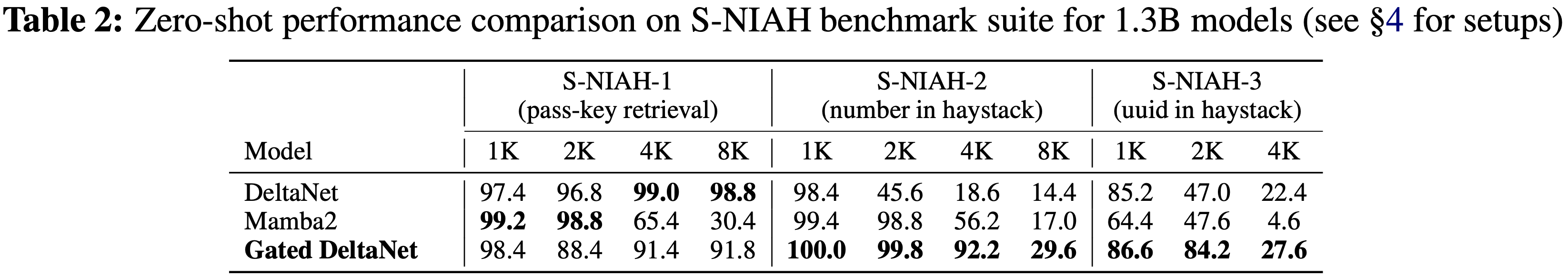 • Mamba2 的性能迅速下降,而 Gated DeltaNet 表现更好,验证了 Delta 规则确实具有更好的记忆能力