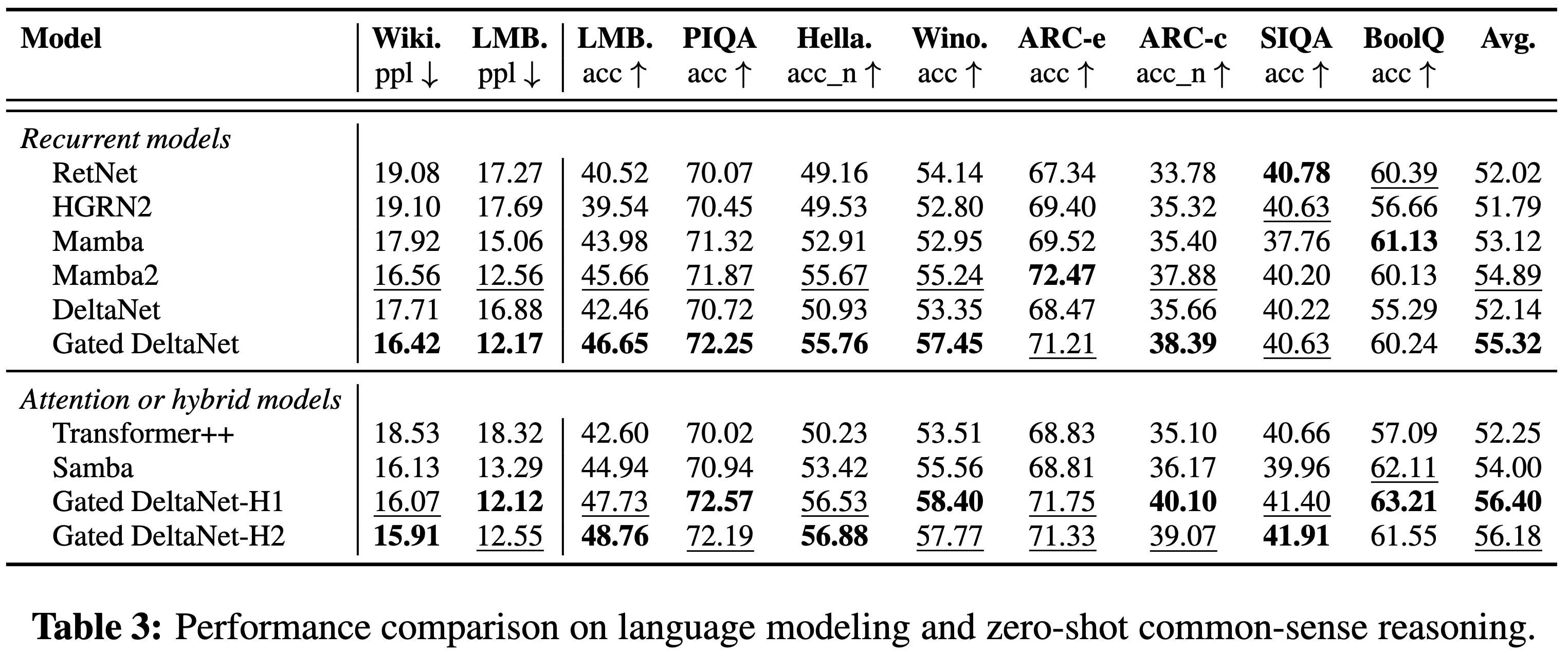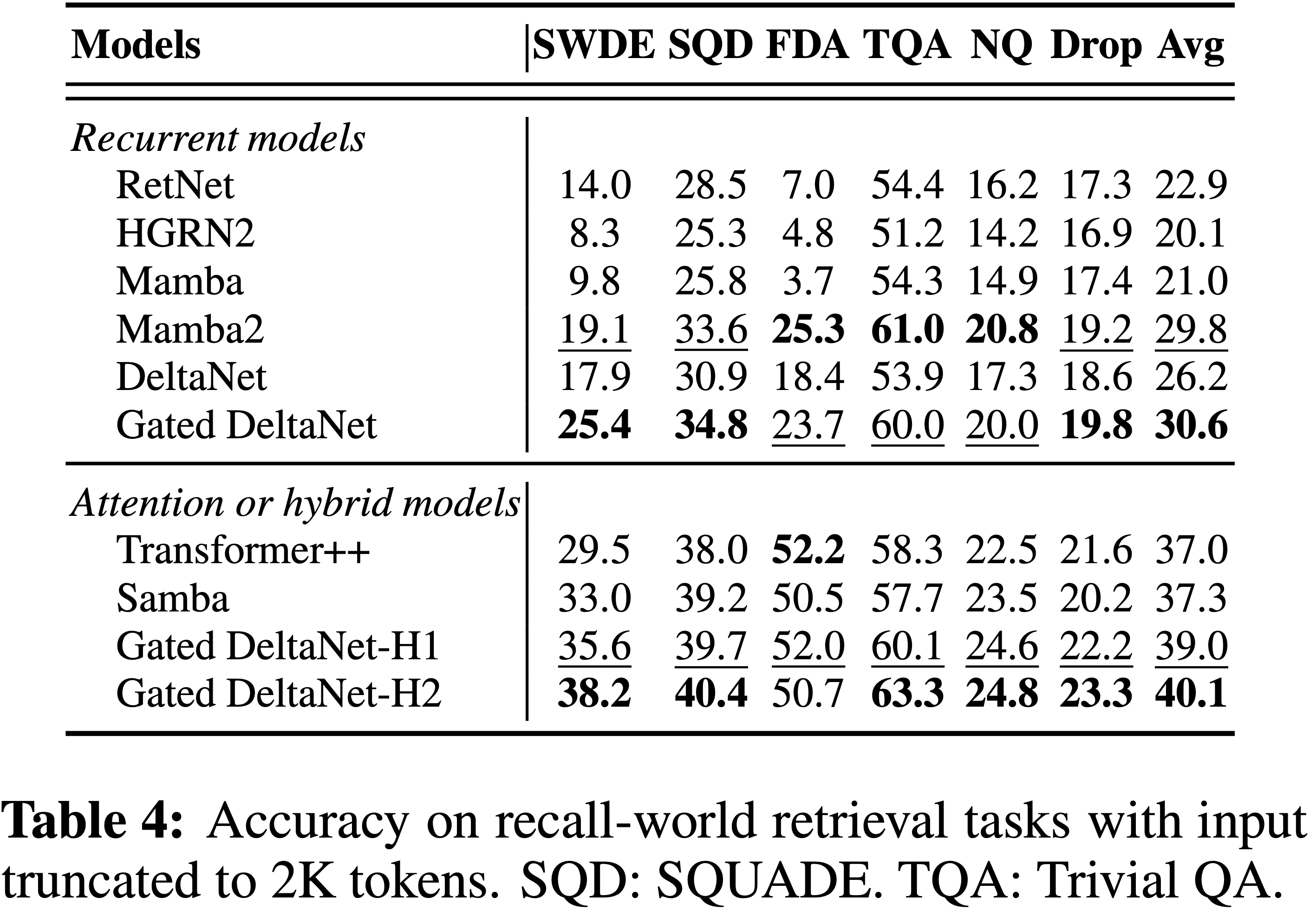 • 在 RNN 模型中,Gated DeltaNet 在所有任务中实现了最低的整体困惑度