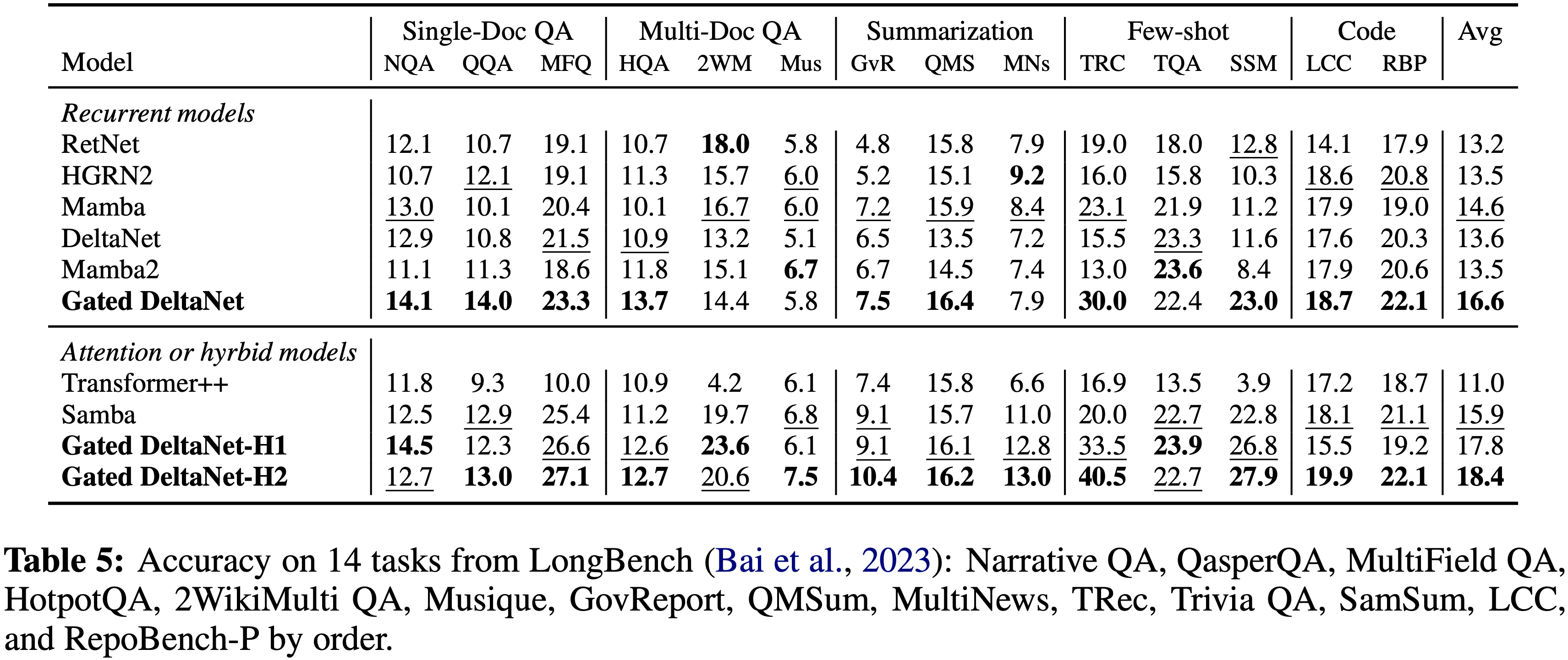 • 在循环模型中,Gated DeltaNet 显示出持续的优势,特别是在单文档问答、少样本上下文学习和代码任务中,分别展示了其在检索、上下文学习和状态跟踪方面的卓越能力