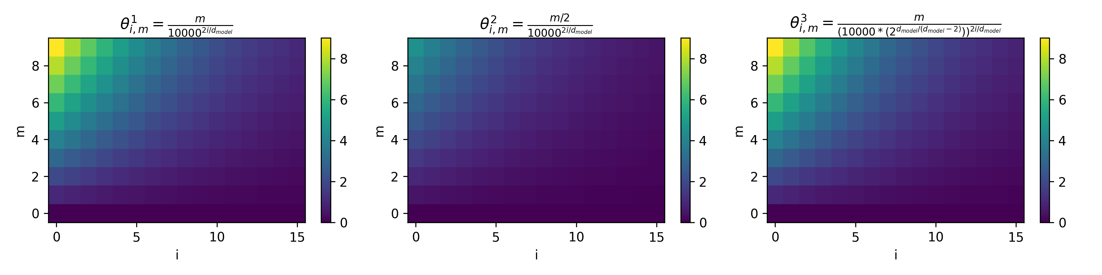 axes[2].set_title(r'$\theta^3_{i,m} = \frac{m}{(10000*(2^{d_{model}/(d_{model}-2)}))^{2i/d_{model}}}$')