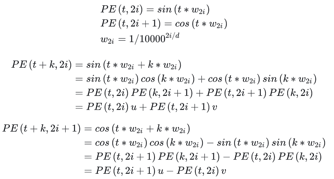 • 特点1:位置向量 \(\boldsymbol{p}_{t+k}\) 可以由 \(\boldsymbol{p}_{i}\) 和 \(\boldsymbol{p}_{k}\) 表示得到(使用三角函数的性质即可证明),以下证明来源于:再论大模型位置编码及其外推性(万字长文)(注:文章中认为 “其中u, v为关于k的常数,所以可以证明PE(t+k)可以由PE(i)线性表示。”这句话理解有误,实际上位置向量 \(\boldsymbol{p}_{t+k}\) 需要由 \(\boldsymbol{p}_{i}\) 和 \(\boldsymbol{p}_{k}\) 共同表示)