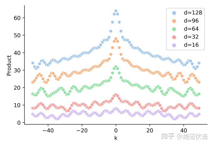 • 特点3:随着相对距离增加,位置向量的内积逐渐减小,有衰减趋势(这里是波动衰减,不是单调的),下图参考自再论大模型位置编码及其外推性(万字长文)