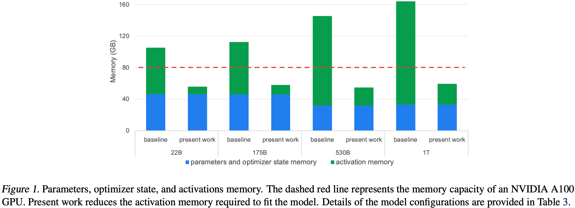 • 论文提出了新技术,帮助缓解存储激活值的内存压力,从而减少重计算激活值的需求