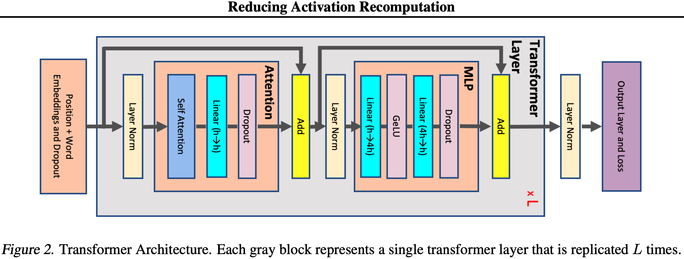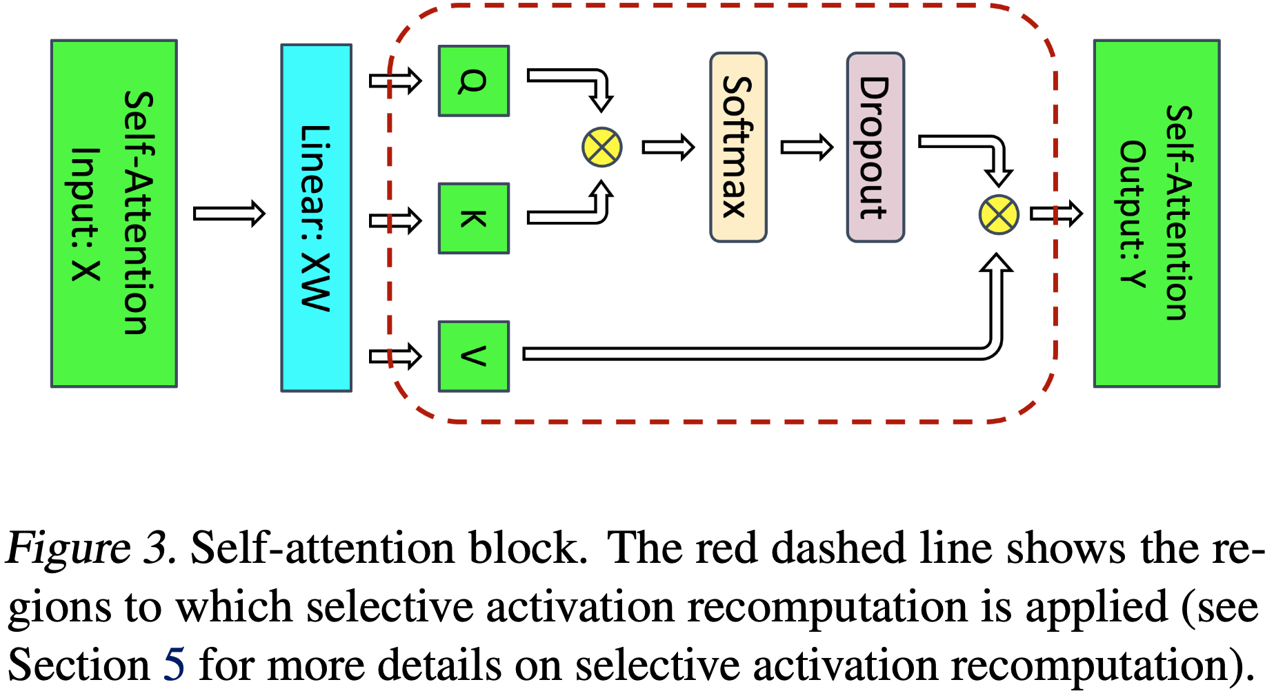 • 对于 Transformer 架构,大多数先前的工作在 Transformer 层边界处检查点(或存储)激活值,并在反向传播中重新计算其余必要的激活值