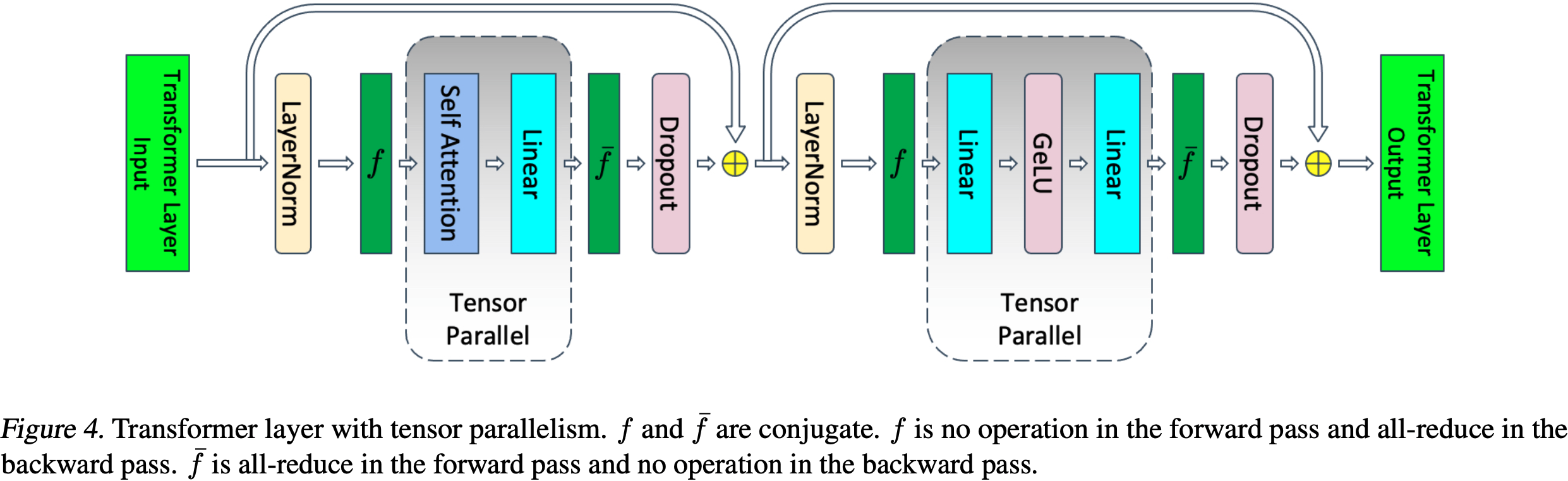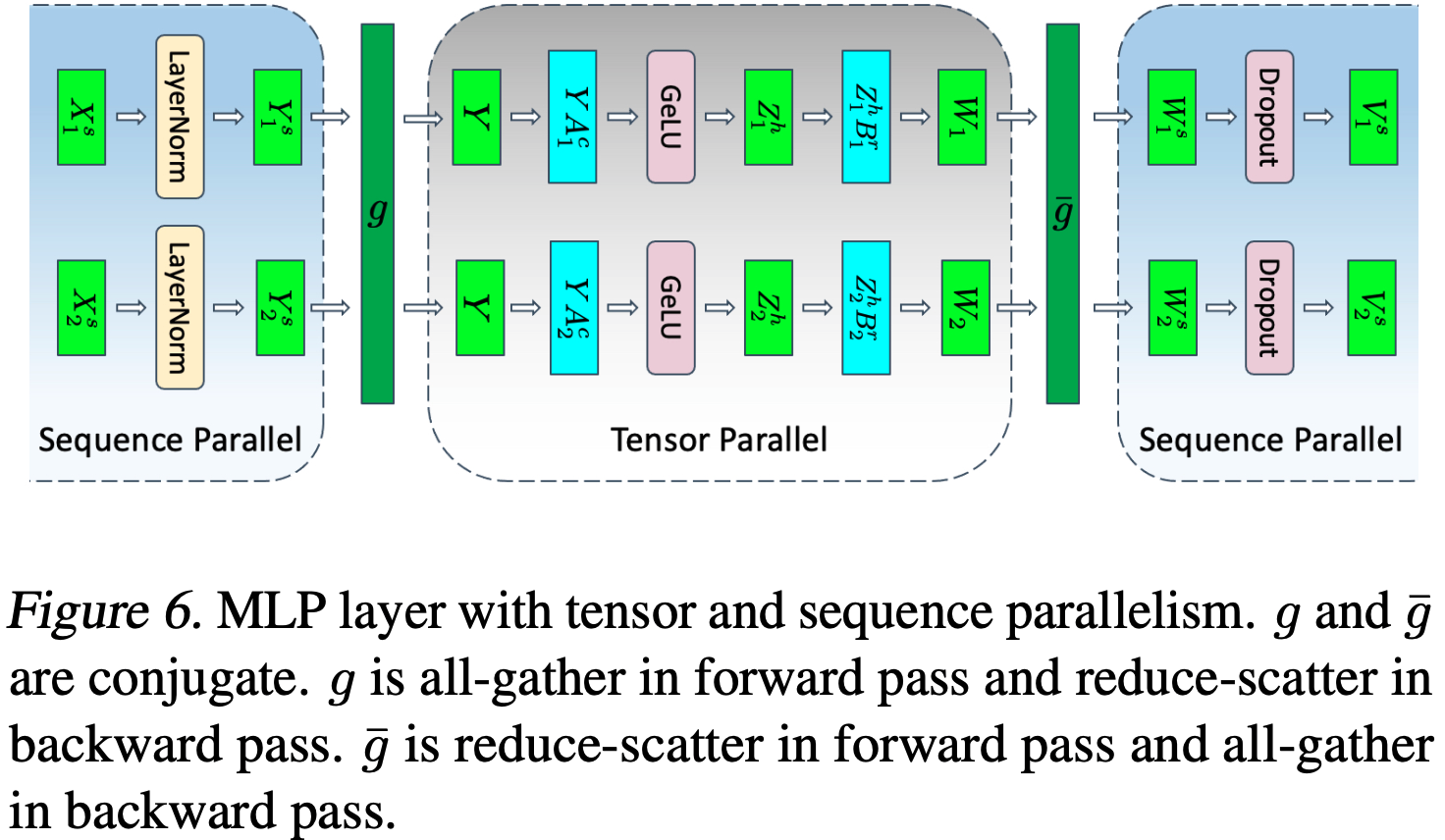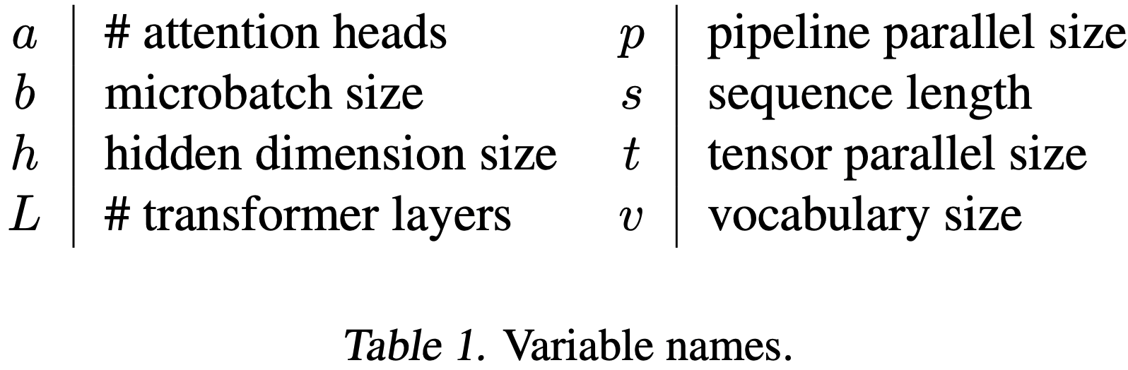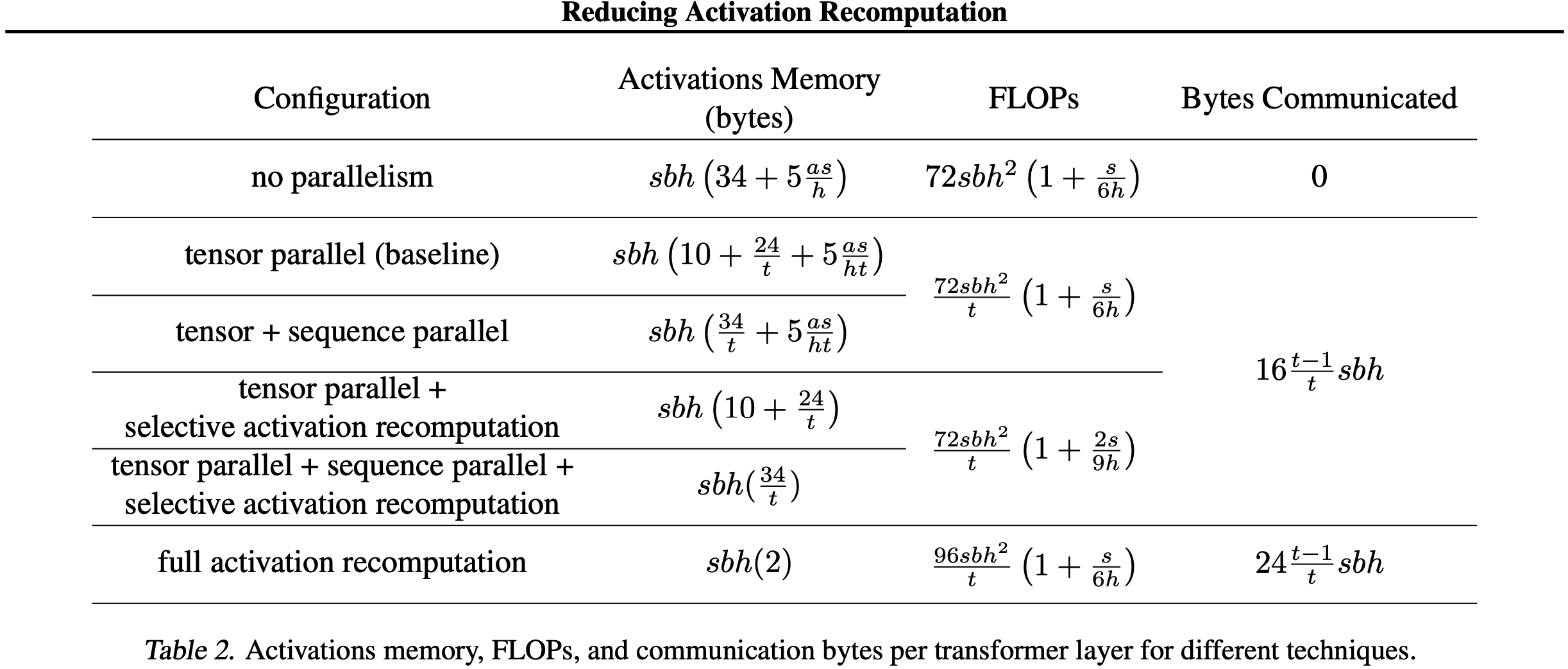 • 补充:结合 张量并行 (tensor parallelism, TP),这些技术几乎消除了重计算激活的需要