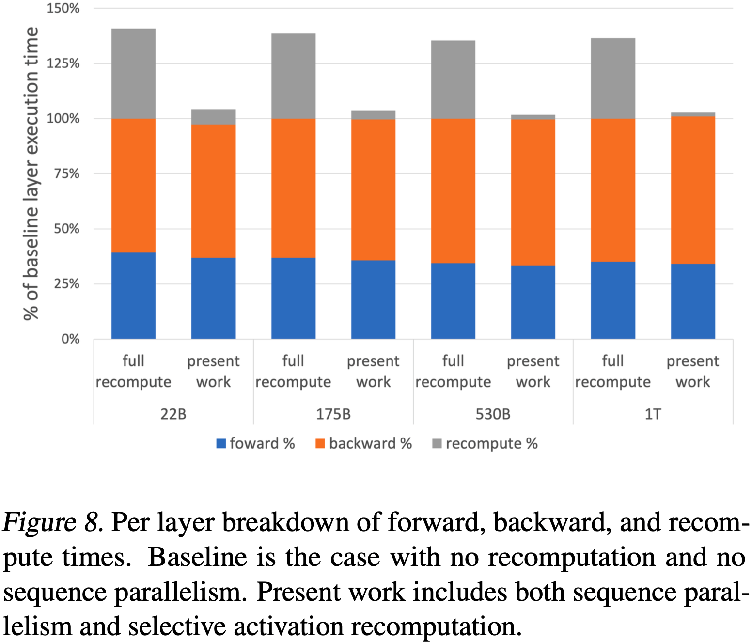 • 实际上,论文发现应用 SP 和选择性激活重计算后,重计算开销已经足够小,以至于这种额外技术带来的改进非常有限