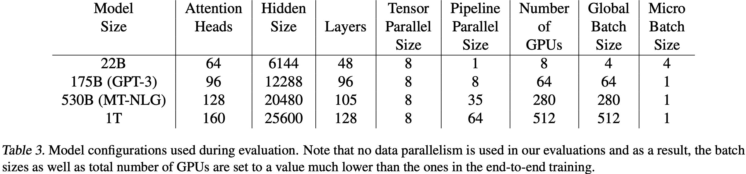 • 为了量化这一点,图 1 显示了从 22B 参数到 1 万亿(1T)参数的四种模型配置所需的内存(模型配置的详细信息在表 3 中提供)