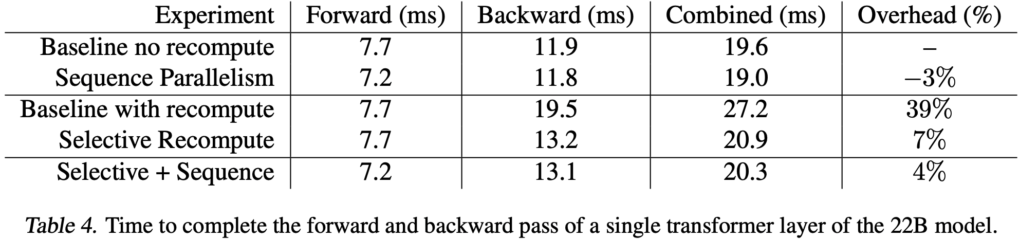 • 为了量化这一点,表 4 显示了针对 22B 模型的各种实验下,执行一个 Transformer 层前向和后向传递的时间