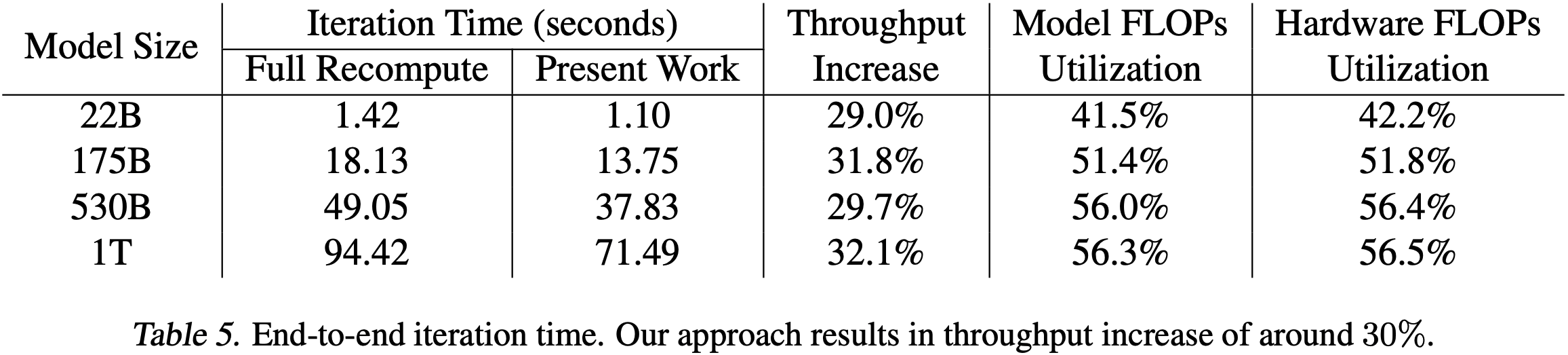• 论文发现,对于所有测试的配置,论文提出的技术相比不使用 SP 的完全重计算,在吞吐量上提供了介于 \( 29.0\% \) 和 \( 32.1\% \) 之间的改进。这些节省将直接转化为更短的训练时间