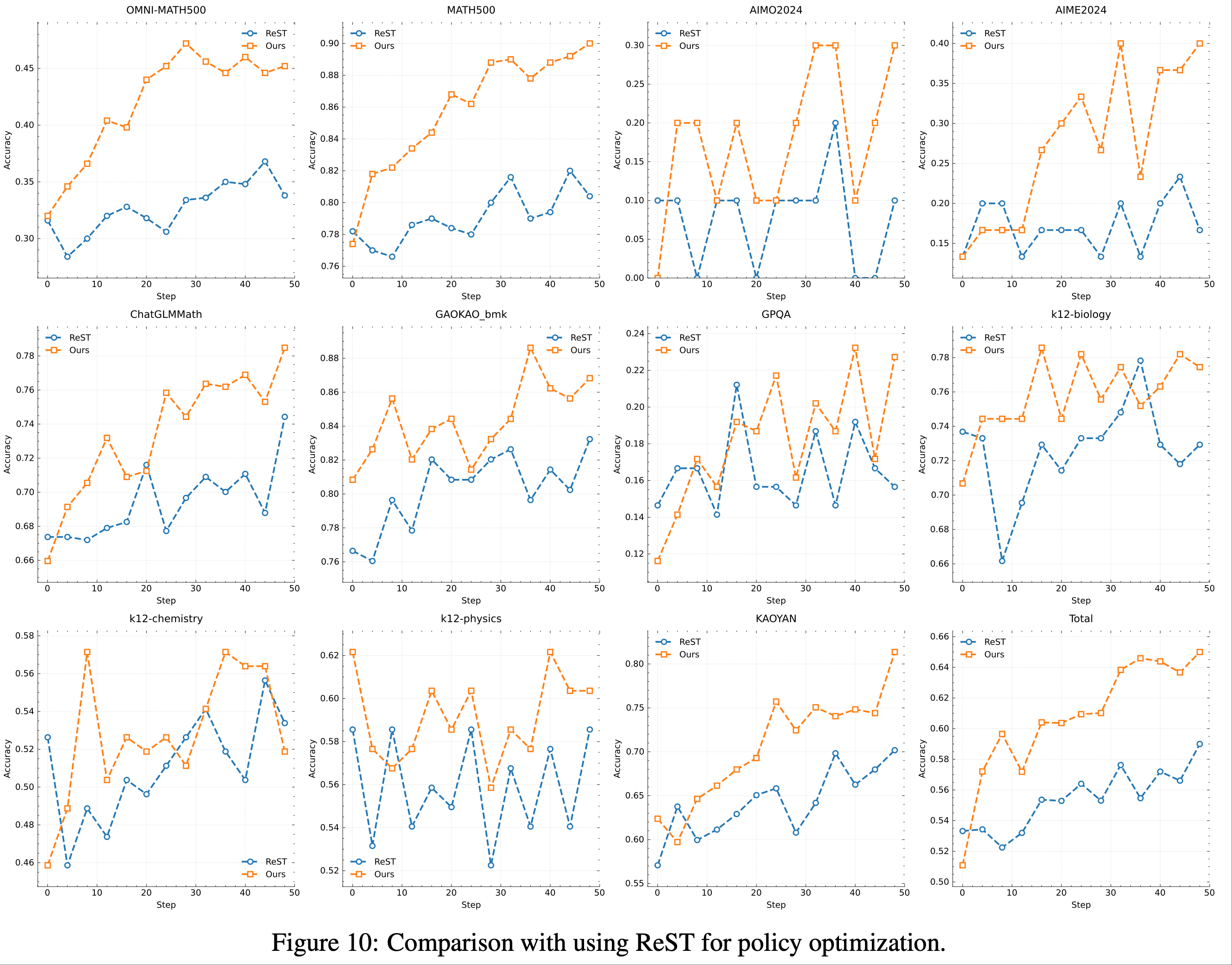 - 同时,在ReST 中,新的训练数据是从优化后的策略里采样得到的,所以策略质量不受原始数据的束缚