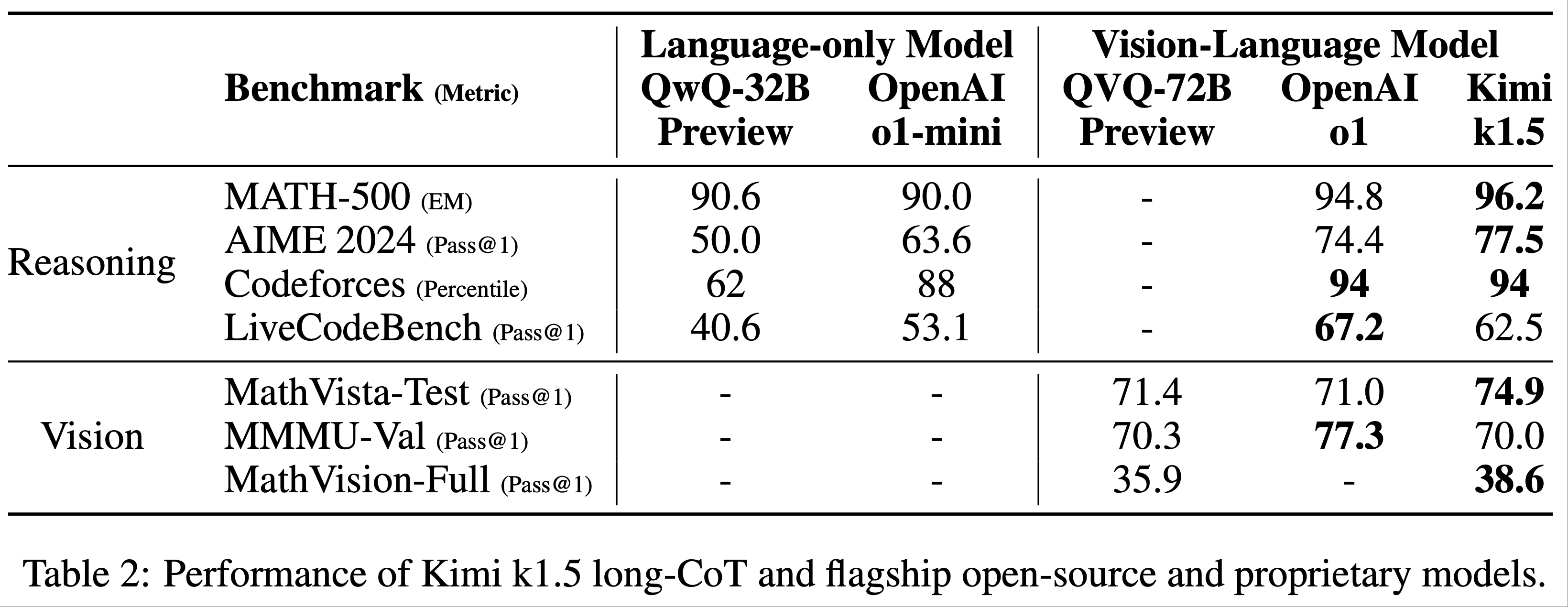 - 论文报告了最新多模态大语言模型 Kimi K1.5 的训练实践,包括其 RL 训练技术、多模态数据配方和基础设施优化