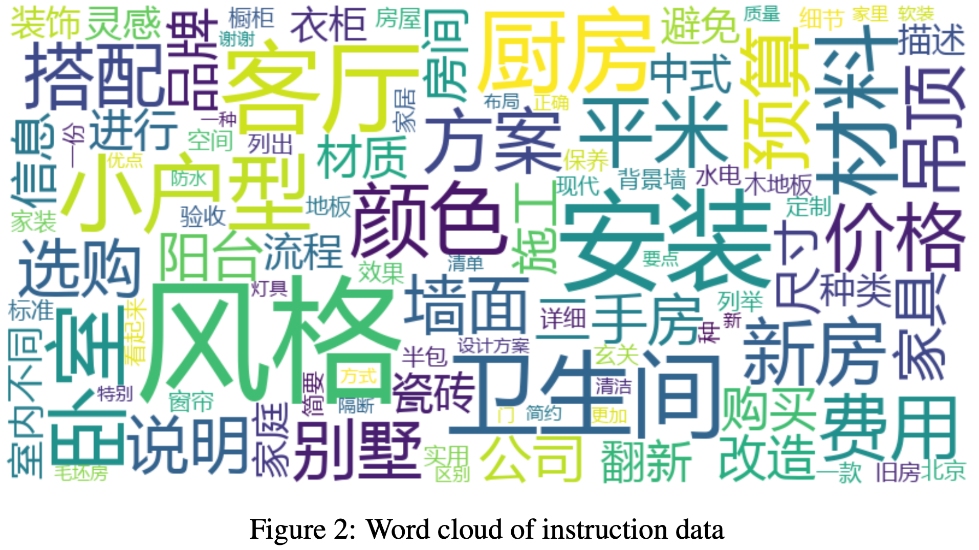 • 基于单轮和多轮对话的指令数据,论文生成了如图2 所示的词云