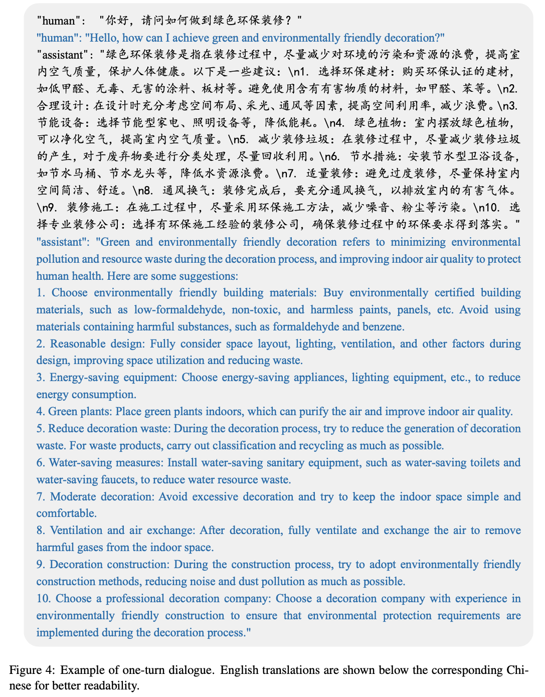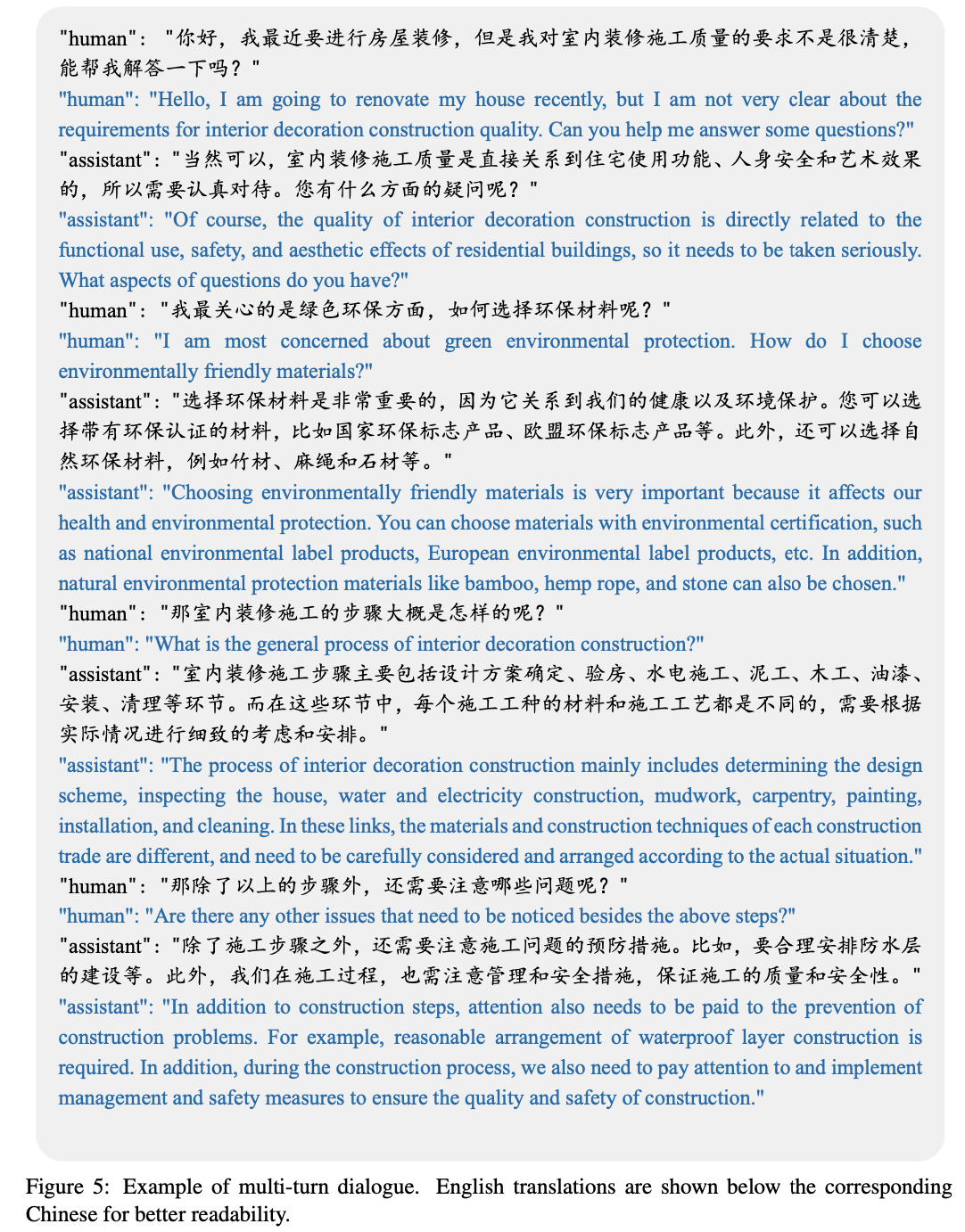 • 多轮对话 :与单轮对话类似,GPT-4 模拟室内设计师和客户的角色,生成了家装领域的多轮对话