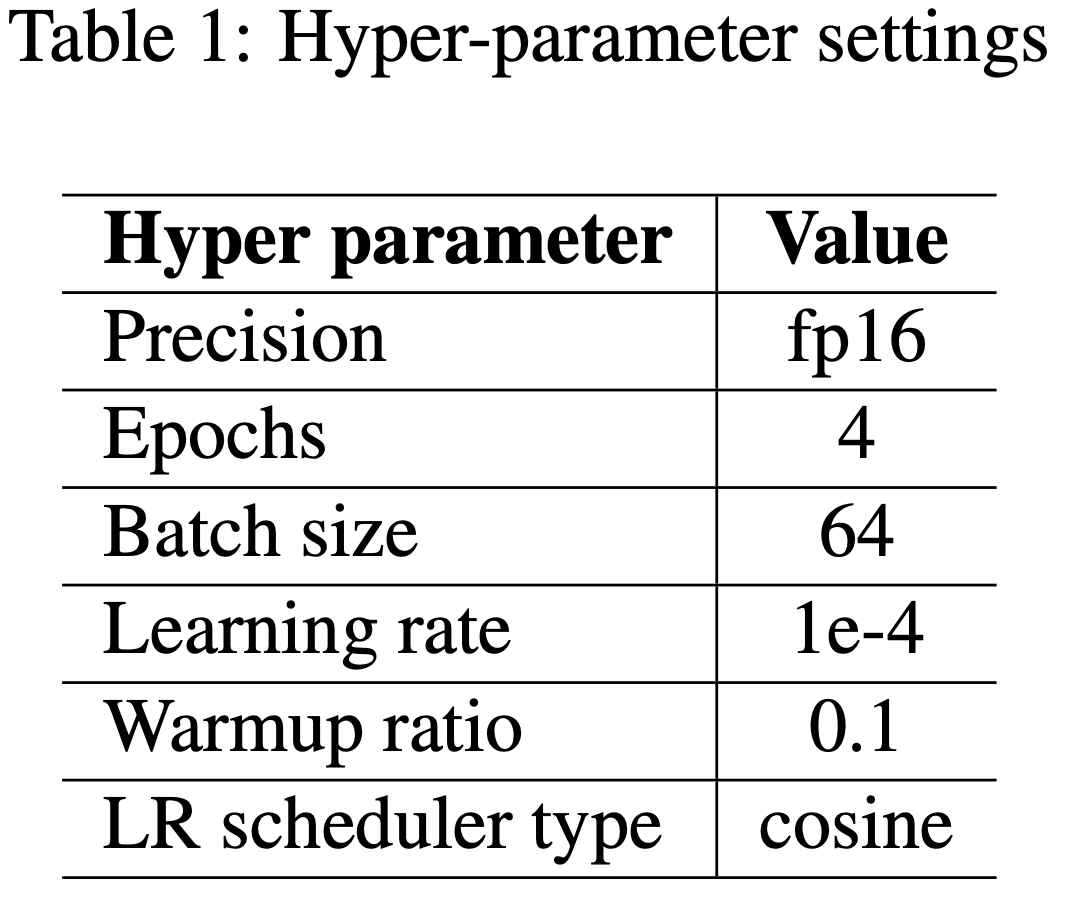 • DAPT 和 SFT 阶段的参数配置如表1 所示,两者唯一的区别在于最大长度(DAPT 为 1024,SFT 为 1536)