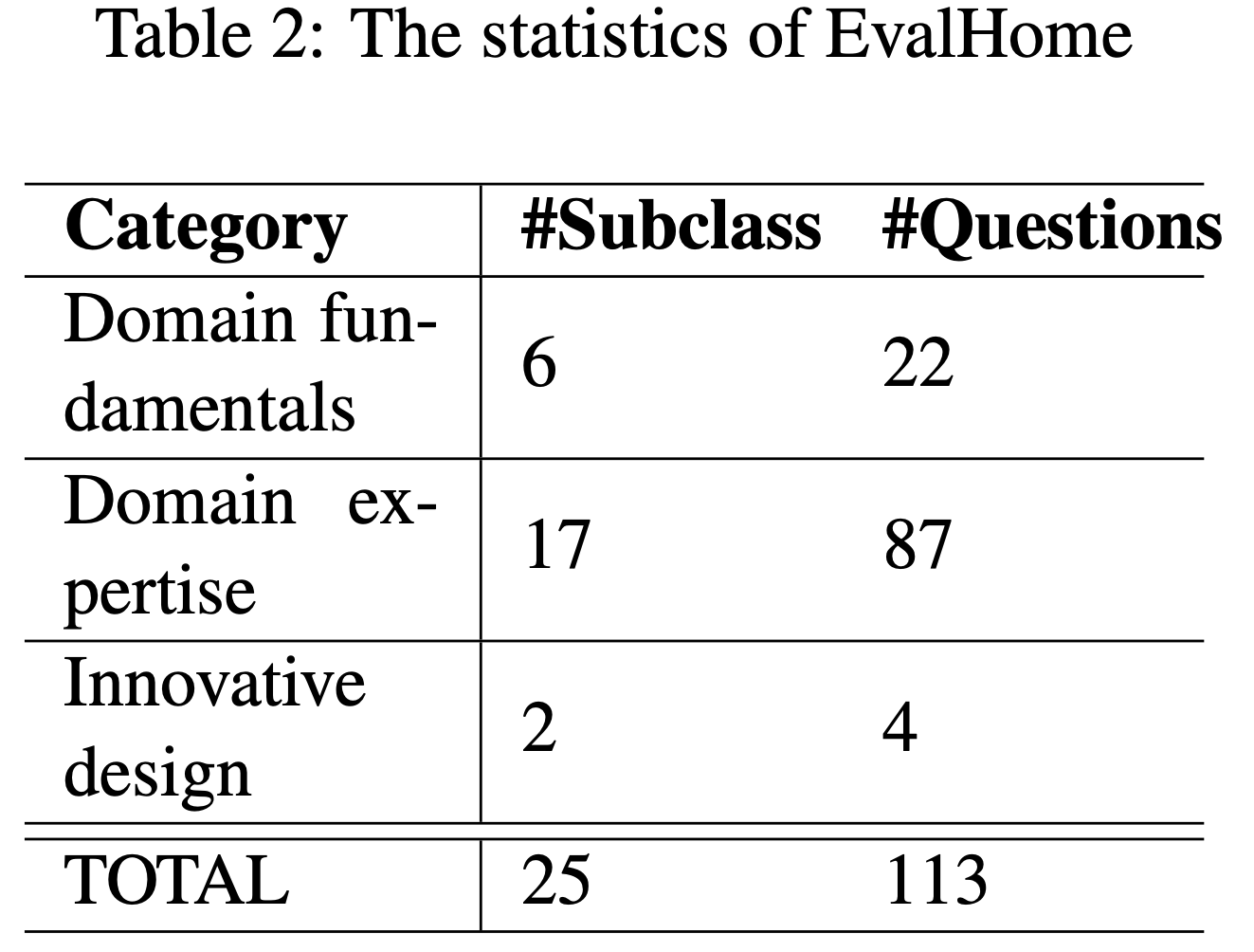 • 论文构建了一个名为 EvalHome 的领域评估数据集,涵盖三个难度级别:领域基础知识、领域专业知识和创新设计