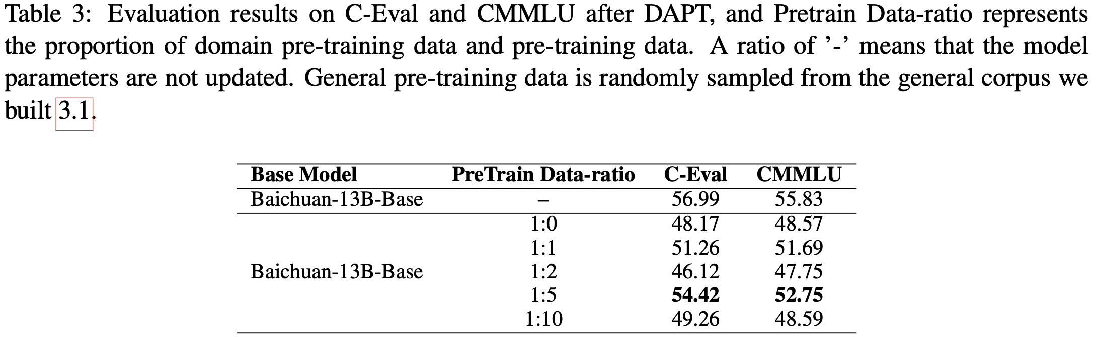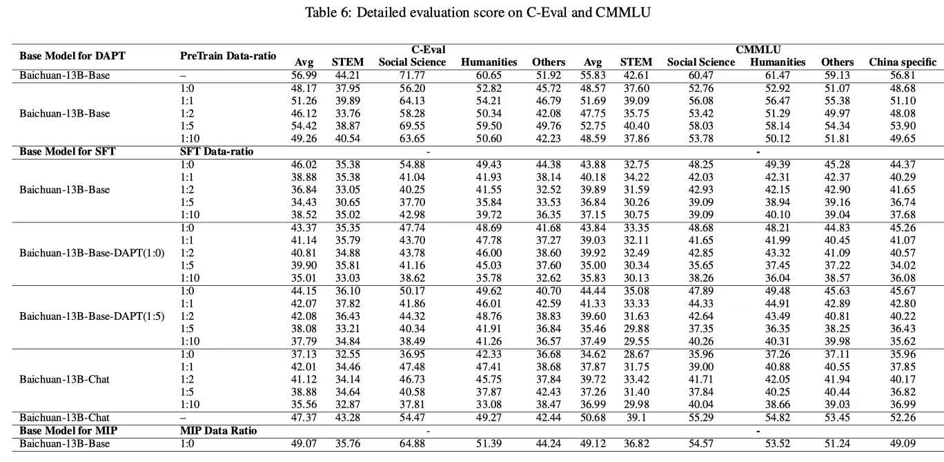 • 尽管在 1:10 的比例下添加了更多通用数据,但 DAPT 模型在 1:5 的数据比例方案中表现出最少的通用能力损失,其 CEval 和 CMMLU 的平均分数相较于基础模型分别下降了 2.57 和 3.08 分。该模型记为 Baichuan-13B-Base-DAPT (1:5)