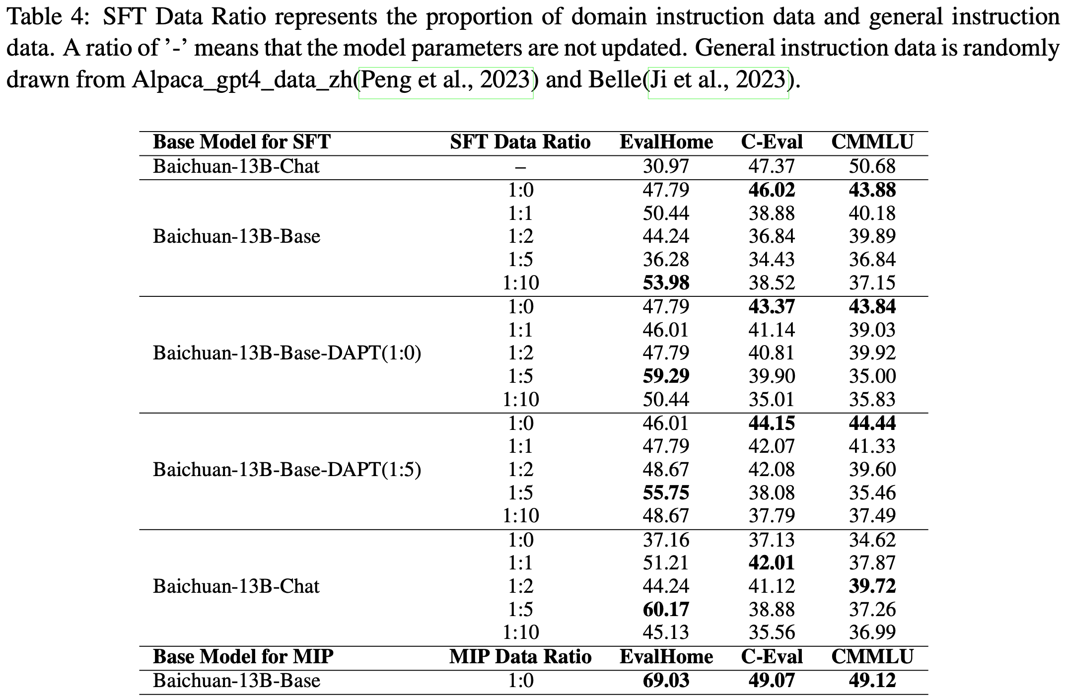 • 可以看到,除了 Baichuan-13B-Base 实验外,其他三组实验在 1:5 数据比例下均取得了 EvalHome 的最佳结果