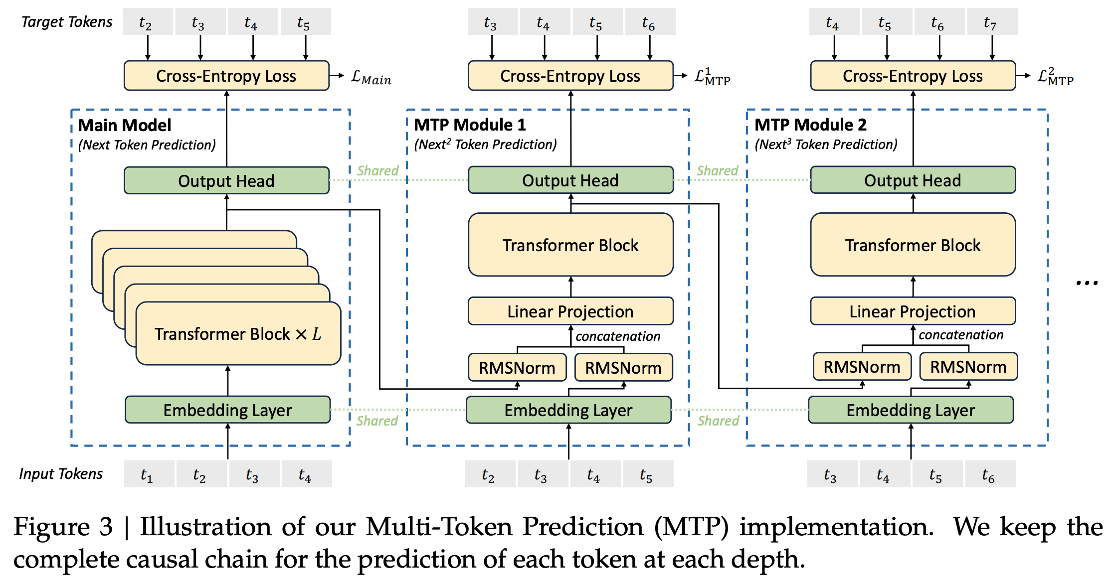 • 问题:上面图中设计的MTP中,无法做到整整的并行,比如,仅知道 \(t_1\) 时,只能预测得到 \(t_2\) ,无法得到 \(t_3\) ,因为在任意一个Module中, \(t_2\) 都依赖着 \(t_3\) 作为输入(只是输入后不用再过 \(L\) 层Transformer Block了,仅过一层就行)