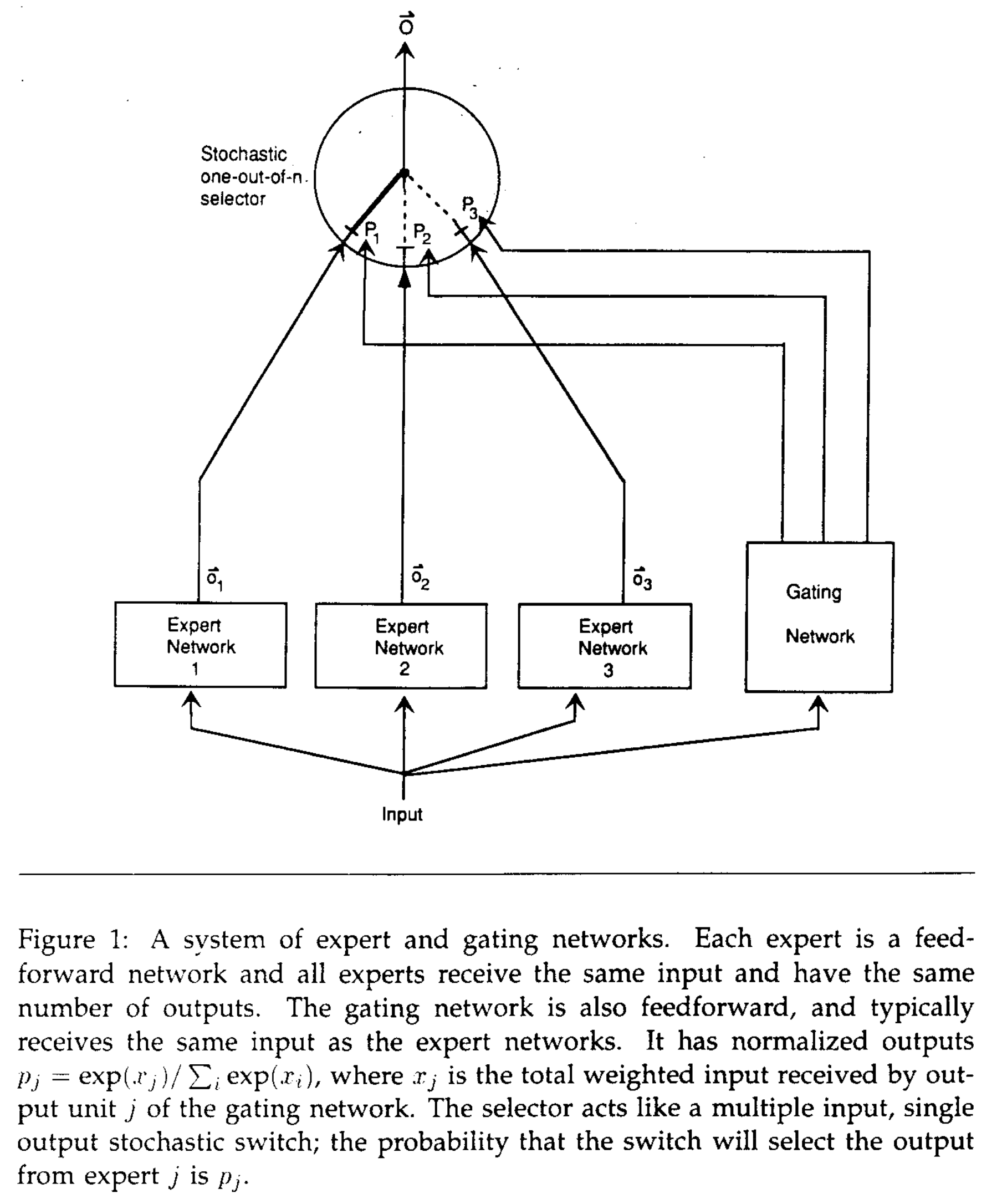 • Mixture of Experts,混合专家模型。最早1991年的论文《Adaptive Mixtures of Local Experts》中提出了混合专家模型的雏形,架构图如下: