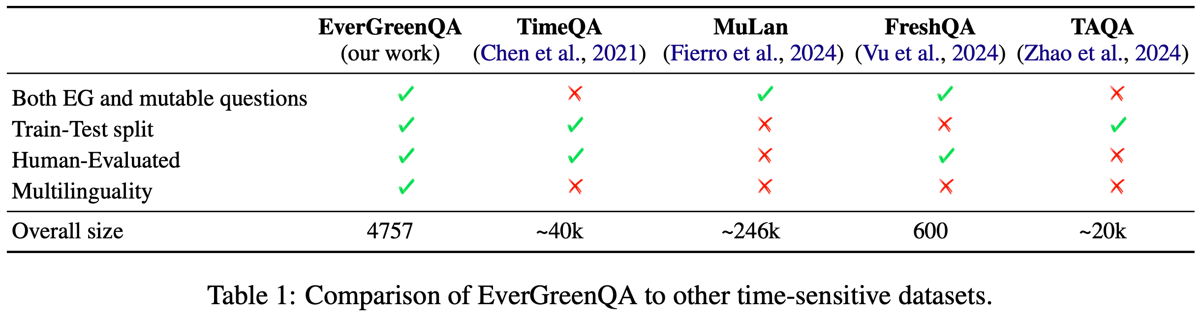 - 论文提出了 EverGreenQA ,这是首个多语言人工标注的常青感知问答数据集,包含适合模型训练的训练-测试划分