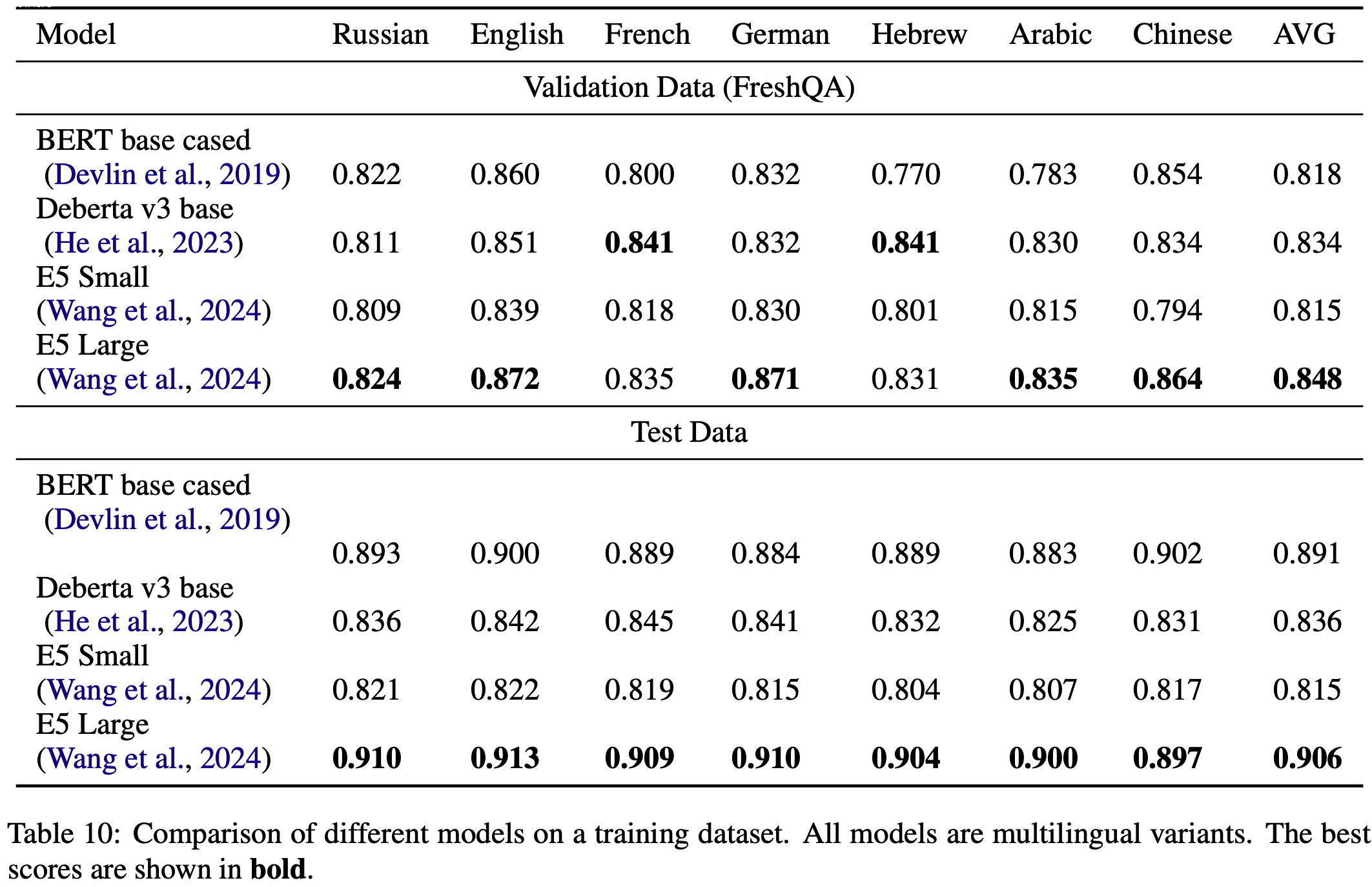 - 论文尝试了多语言版本的 BERT(2019)、DeBERTaV3(2023)和 E5(2024)作为编码器